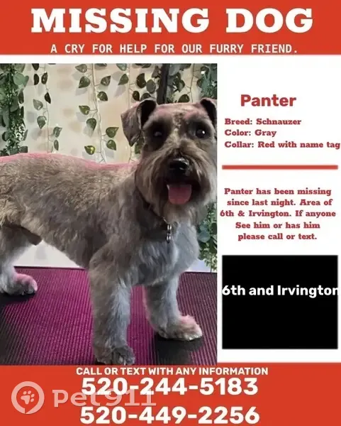 Panter is Gray. He has a red collar on with my info on it. He is well behaved and used to be home only . I cant imagine what he might be going through.. If you have him or have seen him please contact me my info is also on his collar