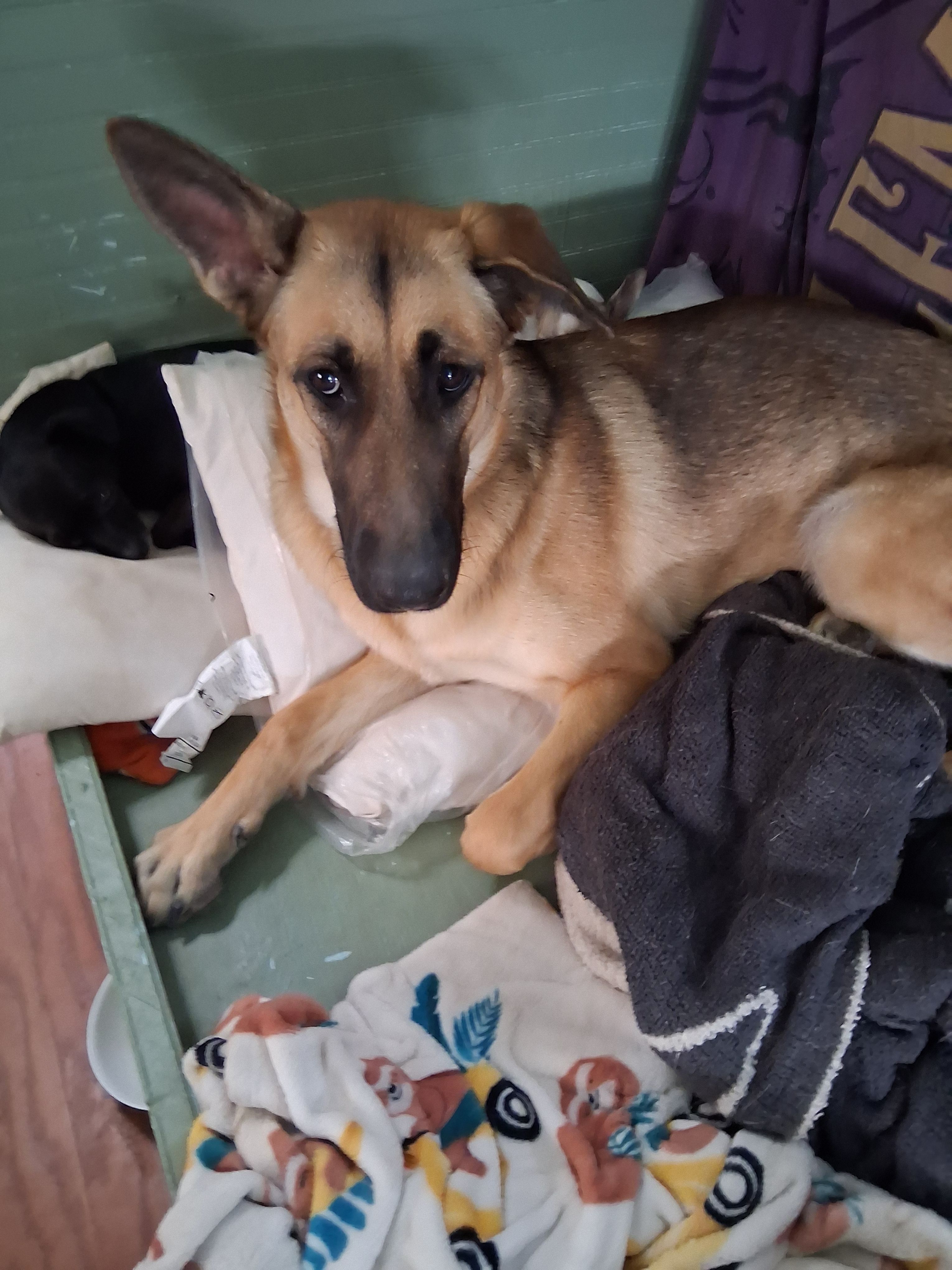 She has a purple collar Long black nose, very sweet dog, does bark alot, gets along with kids older adults, about a year old, she was in my car in the walmart parking lot she must of jumped out of the window, when I was in the store, Also piper has very Long Legs,