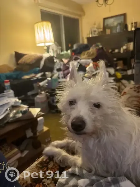 White. Long straight hair. Terrier mix with erect ears. No collar due to PTSD. Fear bites. Do not chase or try to touch. Small but has long legs. She got spooked by someone knocking on the door and when the door was opened and she ran out.
