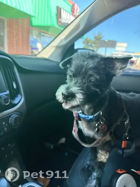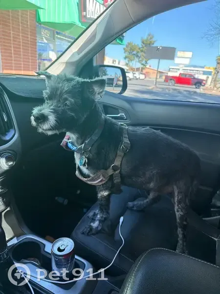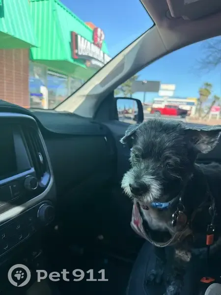 Black and gray. Short hair. Walks kinda funny blue collar missing teeth. His about 20 lbs