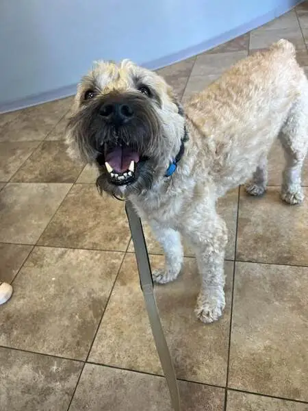 Wheaten, light tan color, long legs. Sweet and timid girl. May come to you if offered food or treats. Please let me know if spotted and I will rush there. Has tag, collar, and chipped.