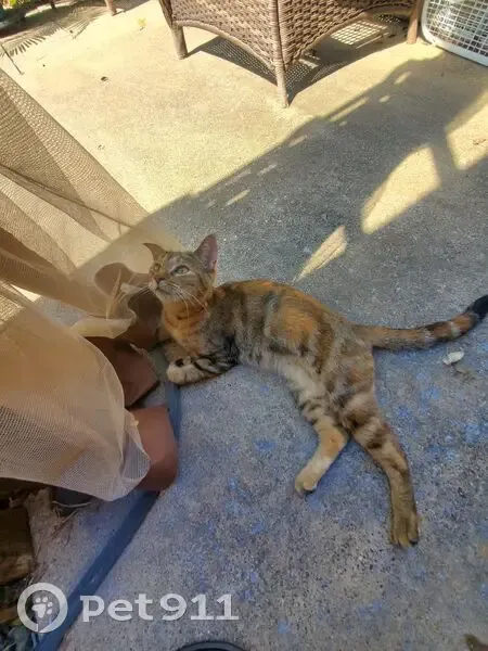 Gray and black tabby with orange high lights. Has a pink collar and is very sweet and knows how to play nicely. She showed up here about 4 or 5 days ago and she finally trusted and came to me today 10/09/2025. She was very hungry and thirsty. I have 2 cats and have had cats most of my life. As long as she stays in the yard and doesn't run off. I'll take care of her till the owners are found.