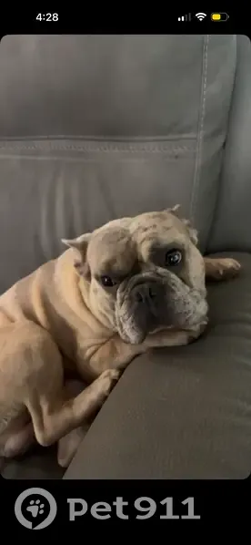 He’s a lilac with darker merel spots he has one blue spot in one of his eyes hes about 30 lbs has a nub tail and only has one nut.. He’s very sweet.. He got out of our backyard wasn’t out 10 mins before my kids noticed and started looking for him..