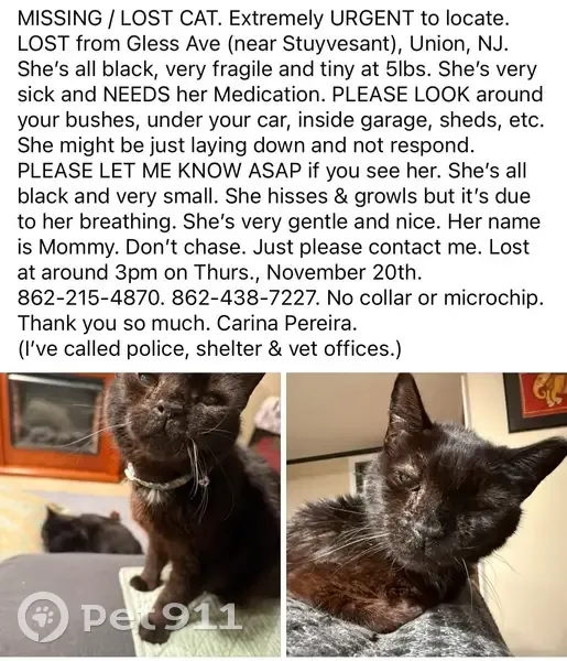 Mommy is very tiny at 5 lbs as she very sick right now. She’s all black and elderly at about 16 yrs old. She hisses and growls but doesn’t bite. She’s fragile, gentle and petite. Please call me if you see her. Don’t chase please. 862-215-4870