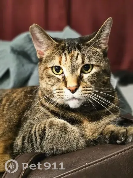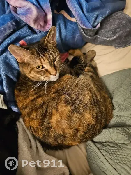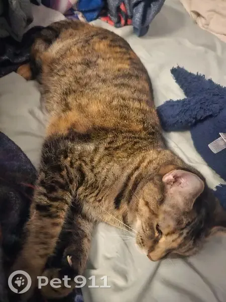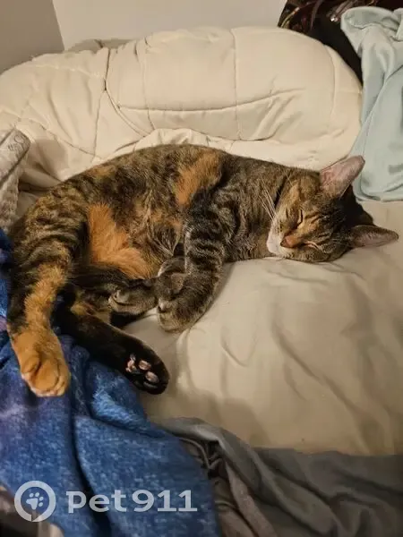 She is a Torbi with brown and yellow patterning. Her lift hind leg has a yellow sock with pink toe beans. One ear is notched at the top. We believe she may have gotten out when our pool was being serviced. She is a sweetheart but skittish. She is best coaxed with a soft voice. Please help me find her. She is like a child to me and I'm am worried sick.
