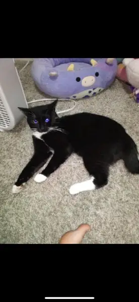Tuxedo cat, black with white on its chest, a white spot on her face, and white on all four paws. The cat is friendly and calm, found her in the parking lot of my apartment complex in Vernon hills this morning.