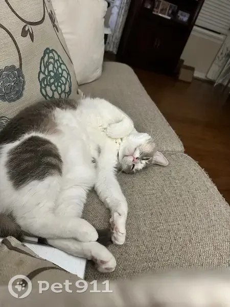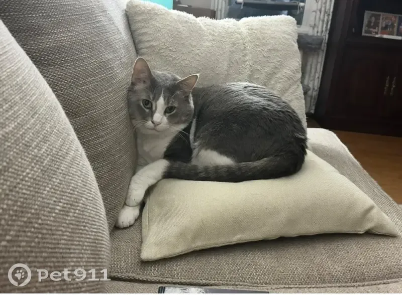 Denny is a large grey and white short hair domestic cat. Very friendly but an indoor cat so likely scared. Mostly grey with white paws and white bridge of nose and lower face. Green eyes