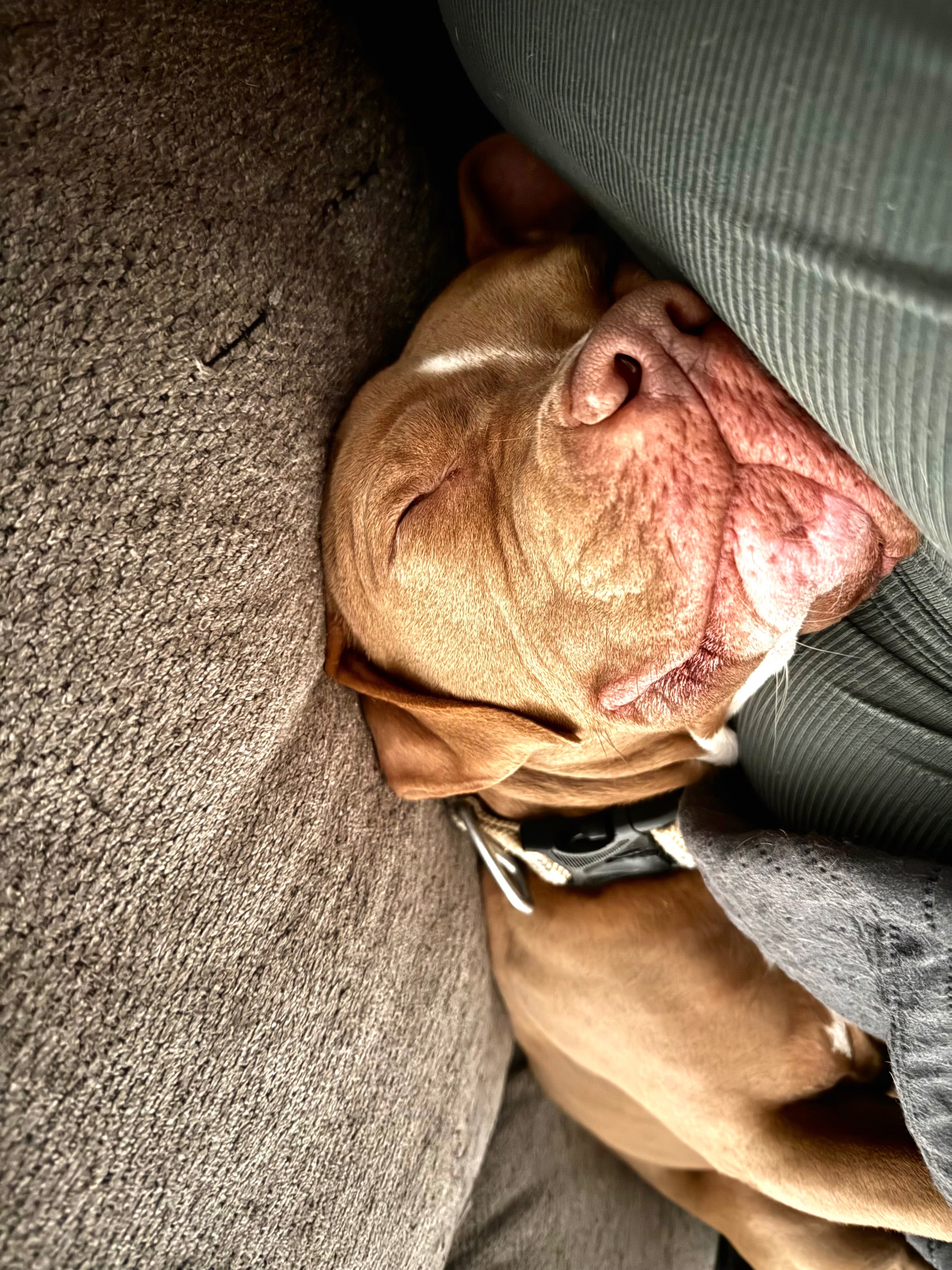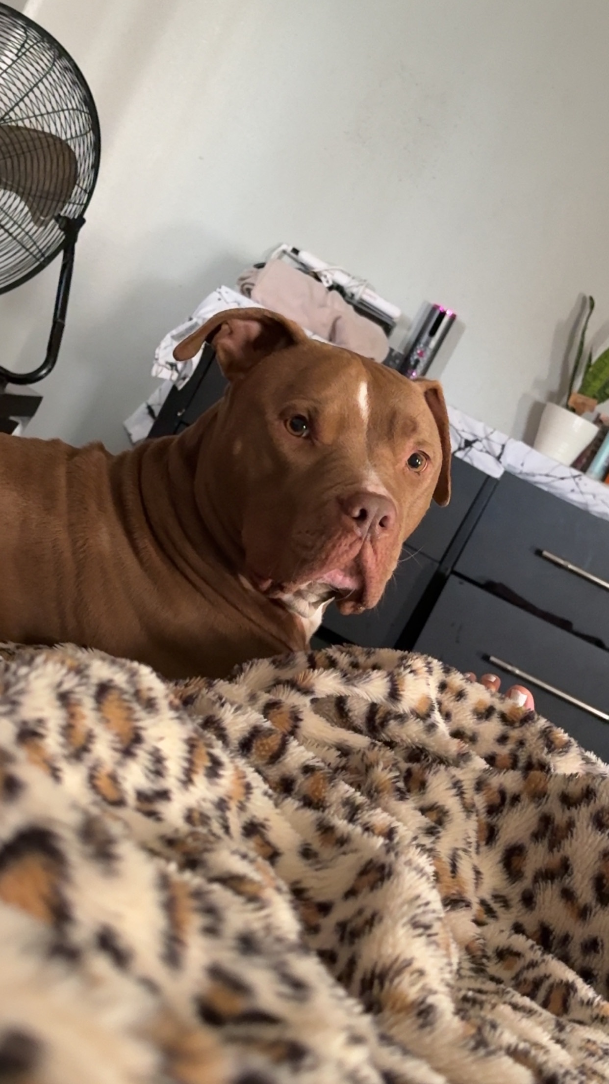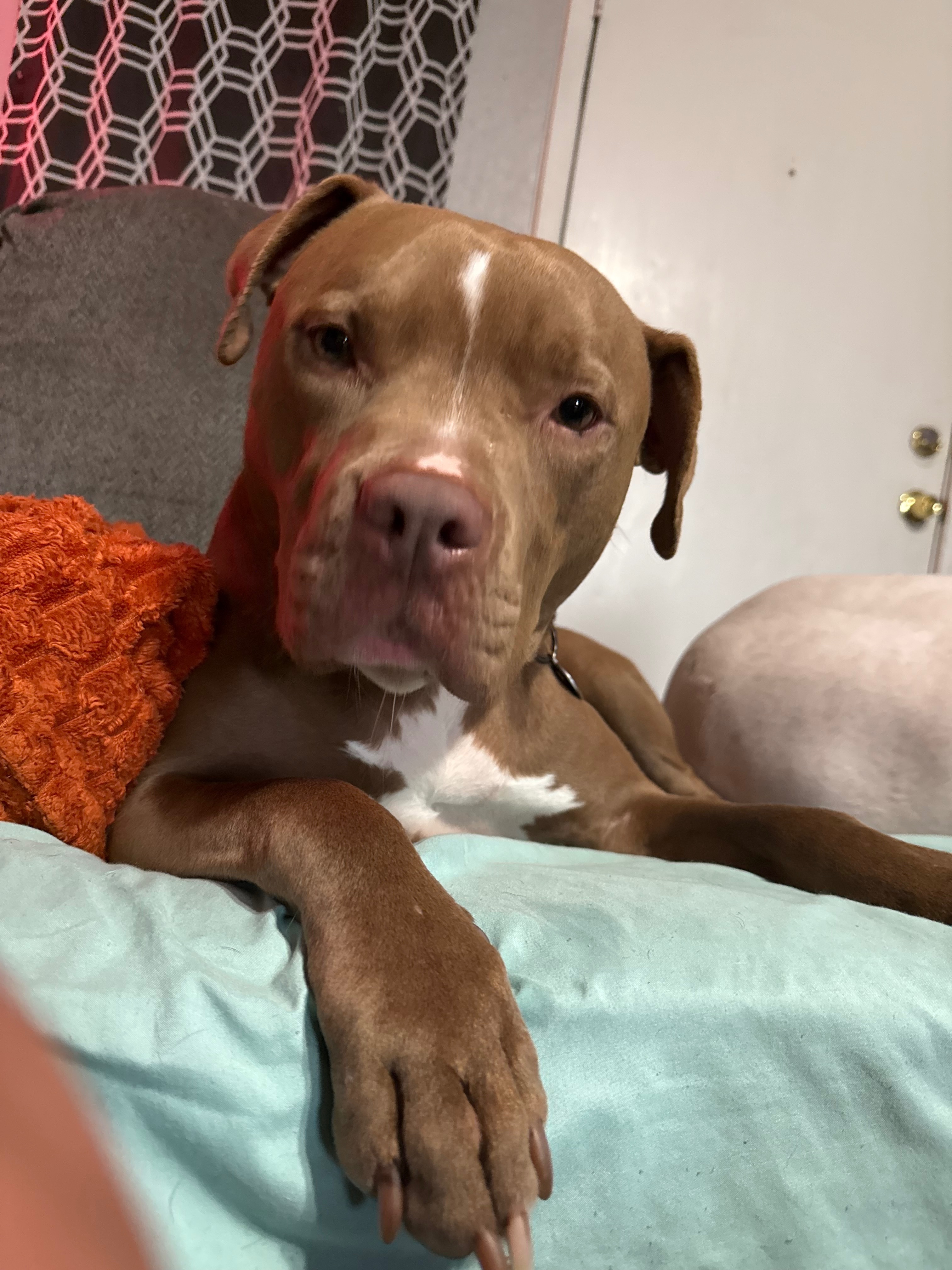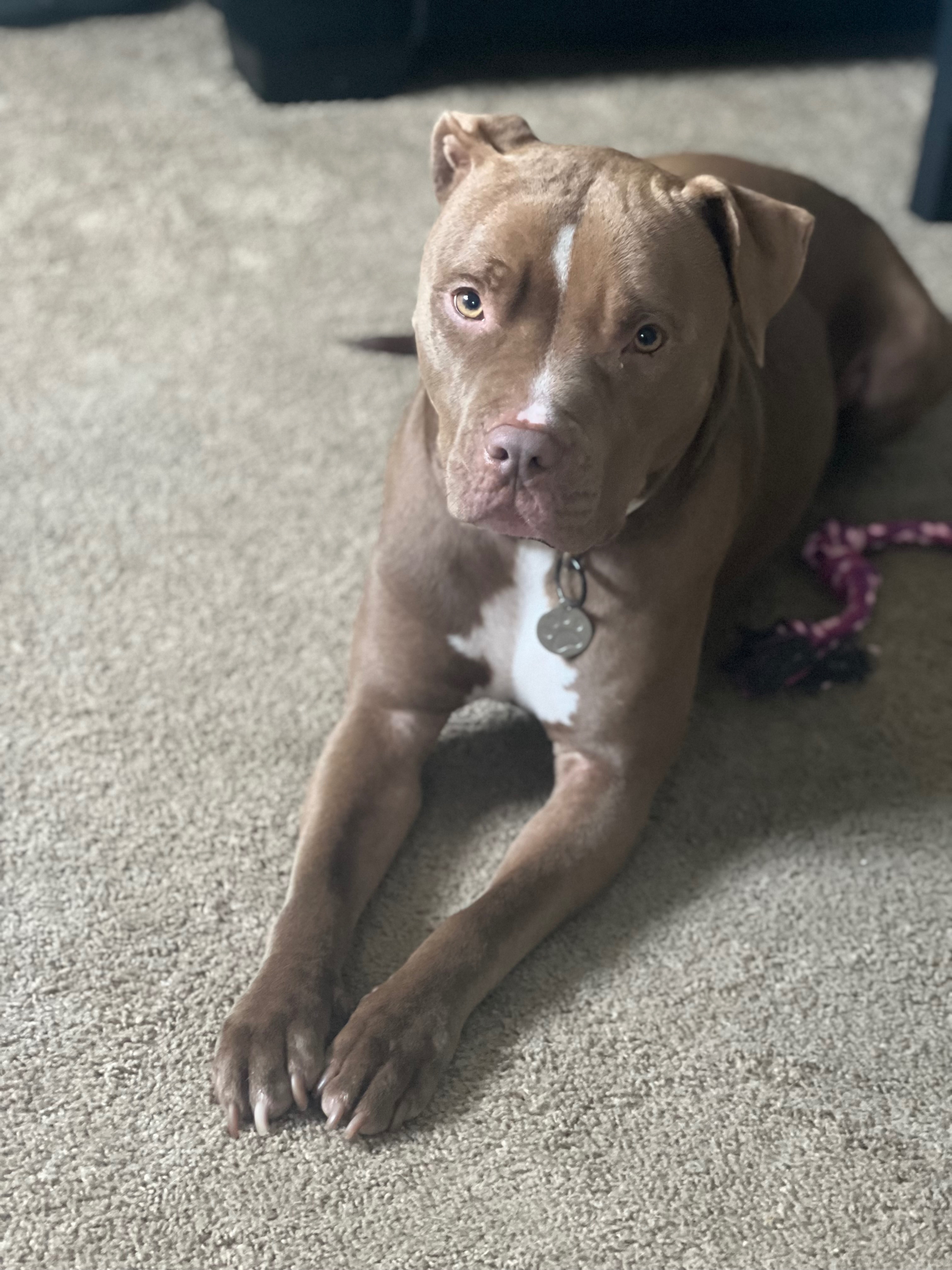 Light Carmel brown. Eyes are greenish. White chest. Has a tiny skin tag near his mouth. Ears he has a lil patch of straight hair sticking out.