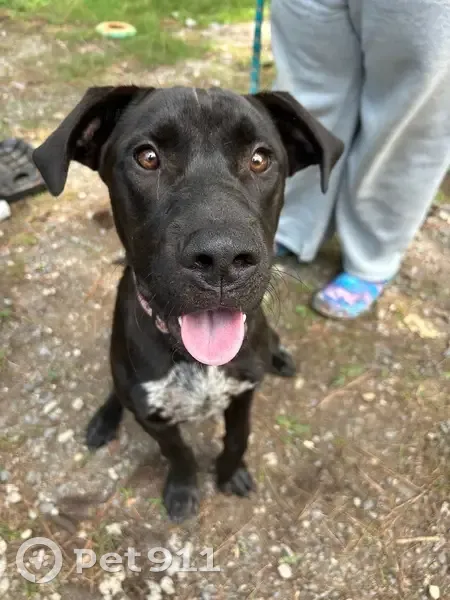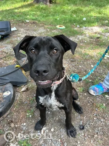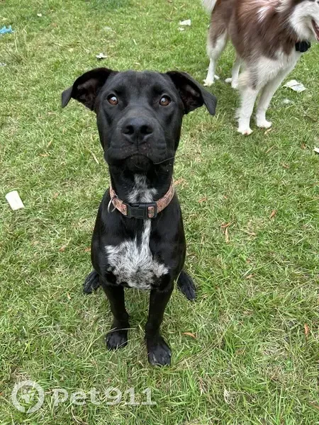 Black with a white and black patch on his chest going up slightly on his neck, he wondered off something Wednesday when I had to charge his collar, he’s a super friendly dog that loves everyone and isn’t scared to walk up to new people.