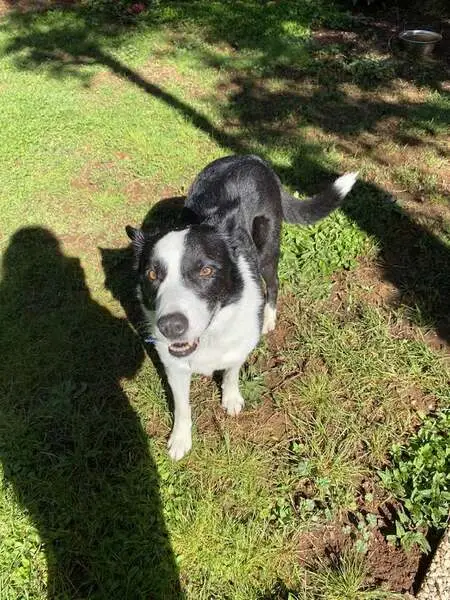 Female dog named Mika, dark brown chocolate color with a white spot on the chest and green eyes. Mixed breed (haund) medium size. No collar