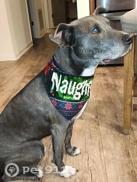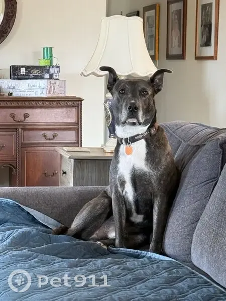 Gray with brindling in short smooth coat. Wearing a green fluorescent collar with bells attached AND a training collar. White front paw, white chest. At home on property and wandered to woods, no response when called.