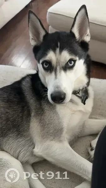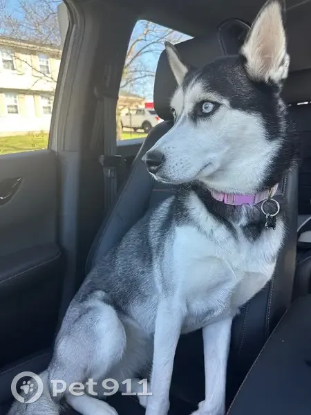 Black and White Siberian Husky, Pink Collar, 45 pounds. Ran out my front door