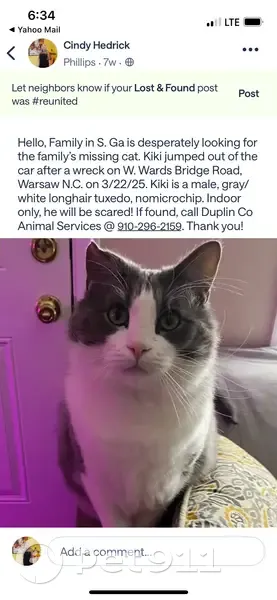 Long hair mixed male (indoor) cat lost in the Warsaw NC area. A family member was driving out of state from Georgia, had a car wreck, Kiki jumped out of car. It’s a long shot BUT I still look for him on a couple of different sites. It would be a miracle to find him. ️
