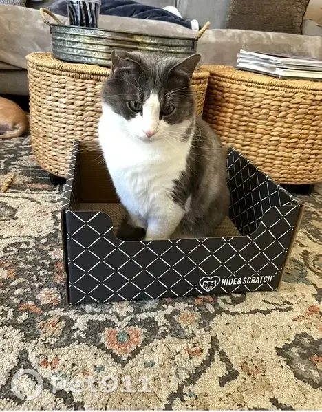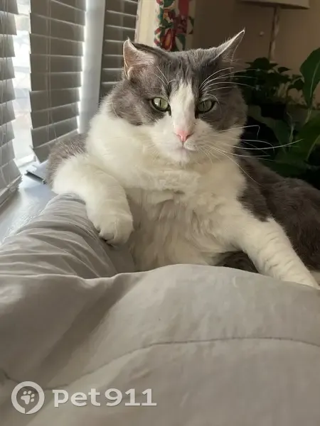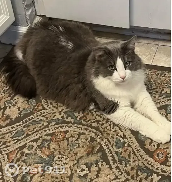 Longhair gray & white tuxedo male, not microchipped. Name: Kiki Indoor cat only. Very scared but friendly.
