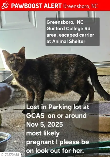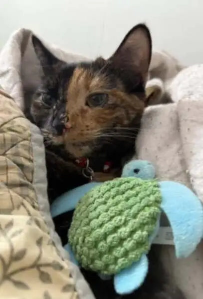 This sweet girl was found very skinny. Tortie and sweet. Does not get along well with other cats, but is happy to be held. She purrs a lot!