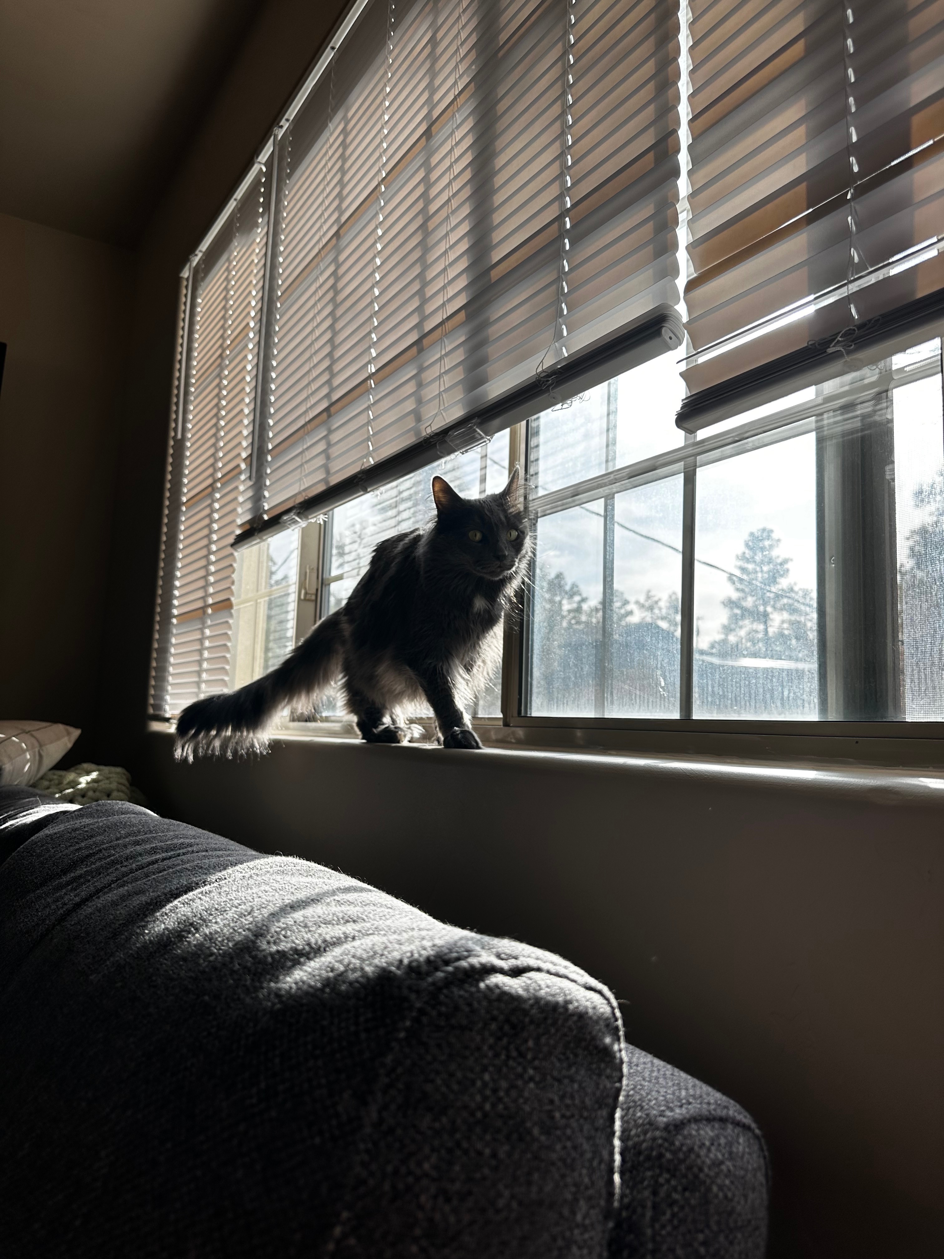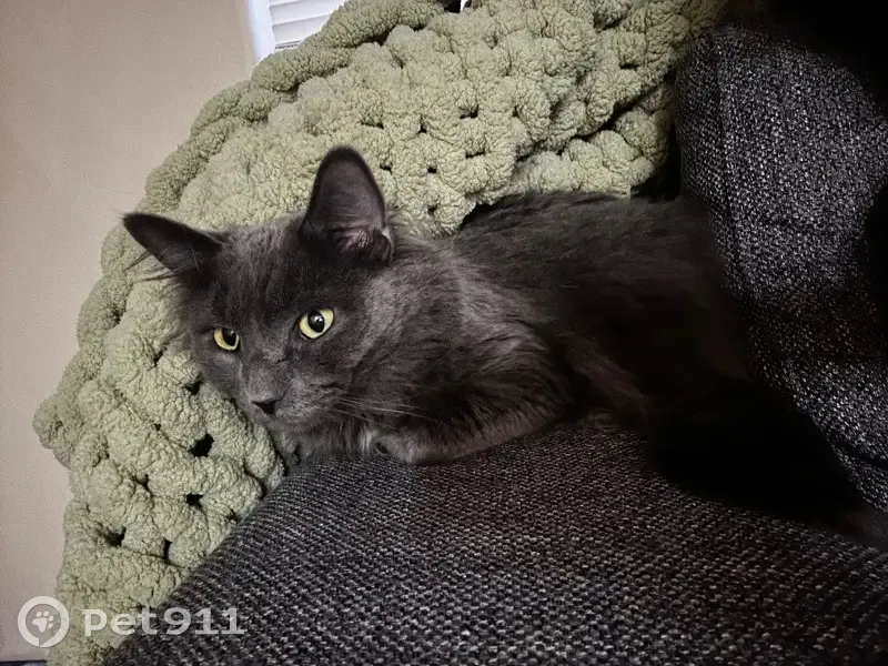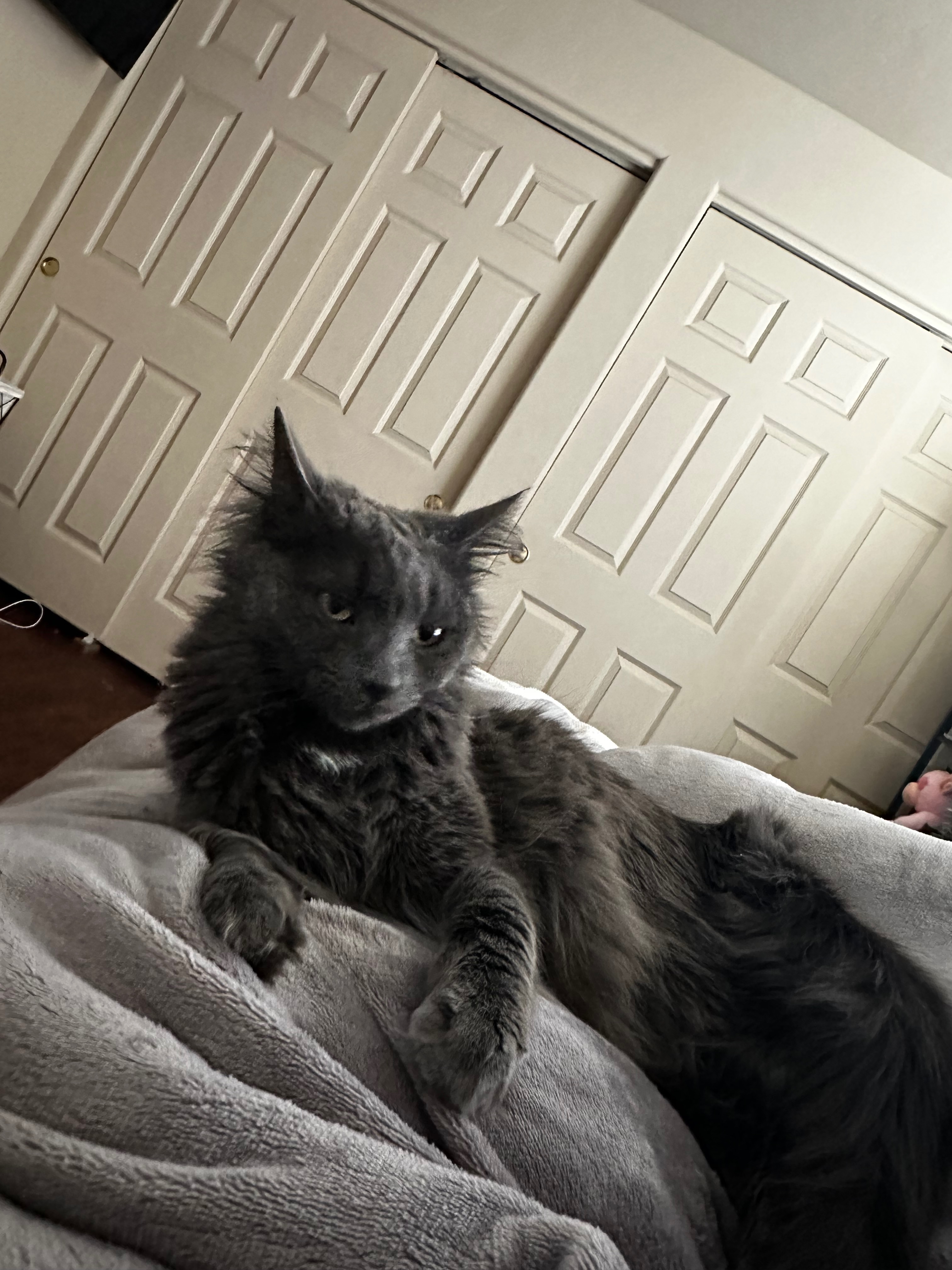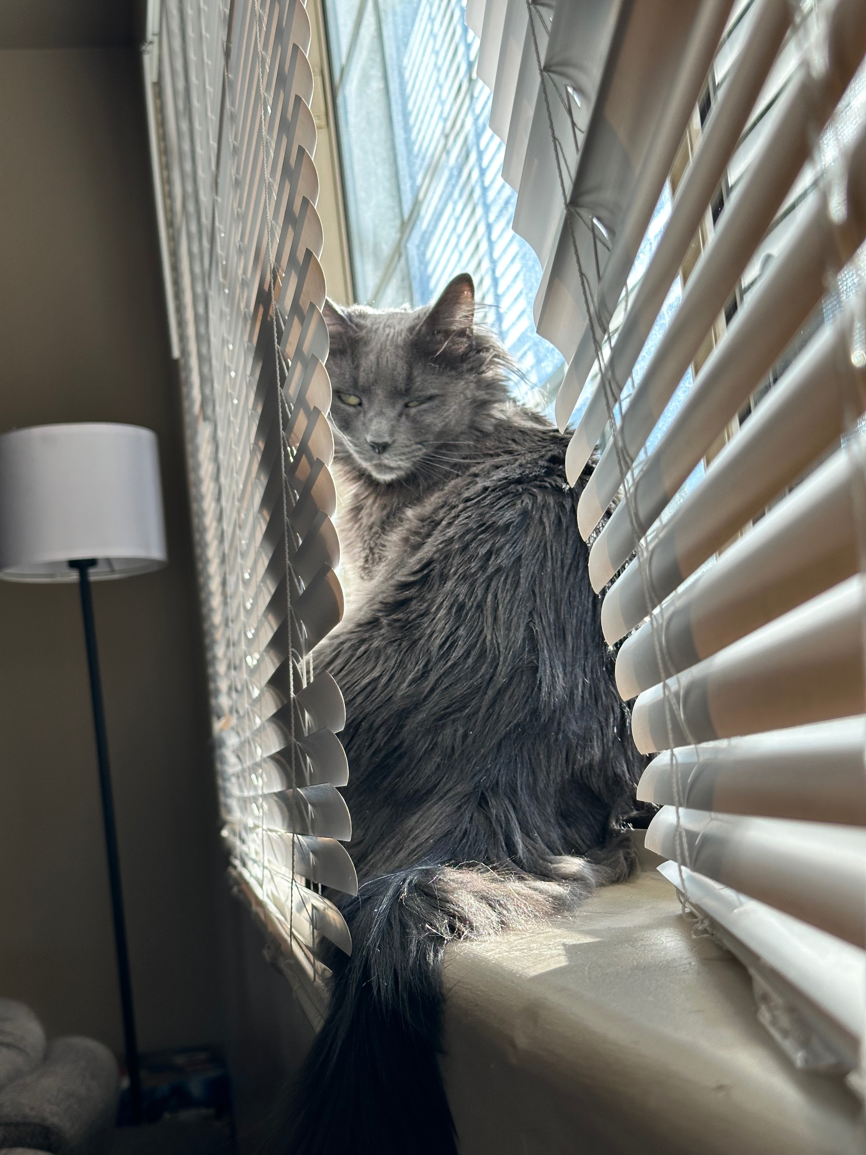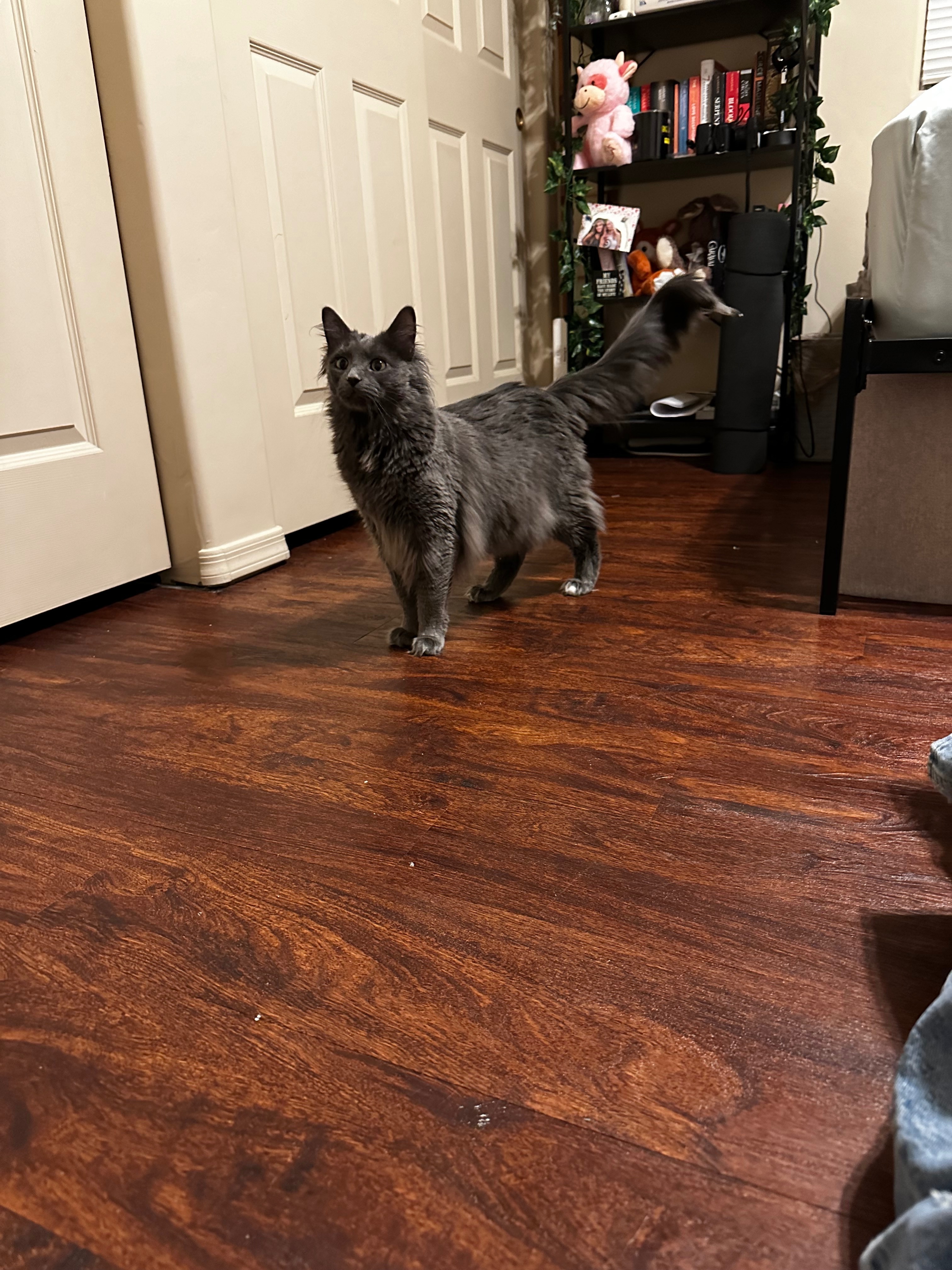 Wren is a long hair grey cat with a white patch in the middle of her chest and has two white back paws. She is 12 pounds. She is very sweet but incredibly skittish