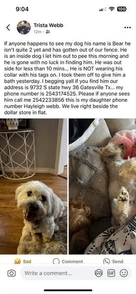 Poor pup, I hope it's found safe and soon! 🐶