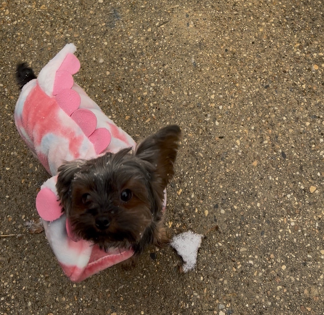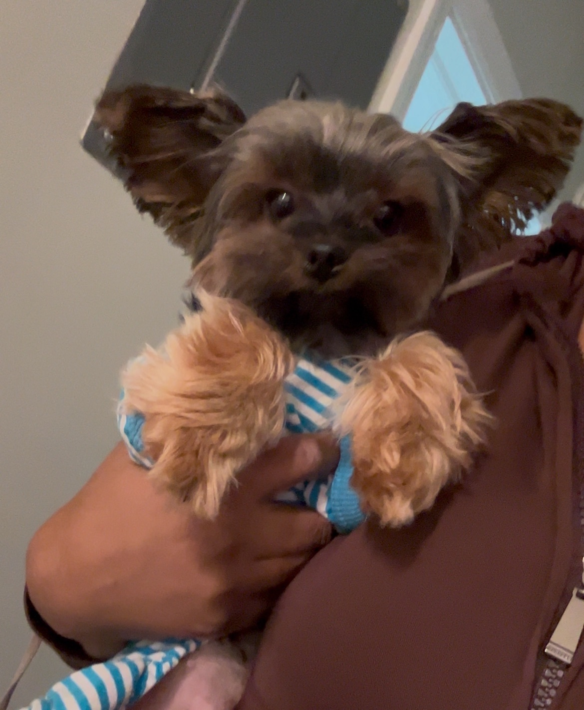 Luna, a female in heat, weighs roughly 5 pounds; her main color is black on her backside and upper torso, while her legs and lower tummy region are brown. Her head is a mixture of black, brown, and grey, and her small face is also black and brown. Her tail is docked and black. She just turned three on the 7th but looks younger due to being small. Her is enlarged and under it there are three black small dots . Luna was LOST on December 11, 2025, roughly around 7pm in Rosedale, Washington, DC 20002. She was last seen at the backyard fence of 1733 F St, where she escaped and was seen picked up by a white SUV on 17th Street NE near E St and roundabout close to Rosedale Recreation and Library . She did not have her clothes on or a leash, and she is not microchipped. Luna is a chill baby girl and doesn’t know any strangers. She gets cold and nervous extremely easily. This week she’s been sensitive and is unable to jump from the chair and will scream if picked up incorrectly. Her hind legs tend to pop out of close (the vet appointment was for yesterday). She gives nonstop kisses everywhere (licks). She enjoys dressing up, cuddling, and getting treats. Her trigger words for her ears to perk up are “chicky waffle” (her favorite treat), “belly rubs,” “treats,” “beary” and “tigee” (tiger), and “squeaky” and “pink ball” (all her favorite toys and bears). If you say, “Let me check your butt butt,” she will automatically roll on her backside and allow you to ensure there’s no extra feces stuck on her hairs, and once you say, “All clean,” she will jump up. If she hears you, Luna, why did you—? Her ears will lower, and she will hide if she’s potted outside of her mat. I’ve had Luna for three years, and we just moved to this area two weeks ago from GA. She’s my documented ESA, and I am devastated. I am willing to give a $1000 cash reward. Please help to return her to me.
