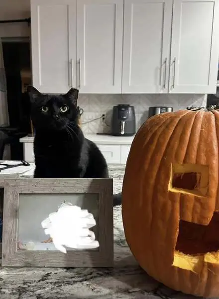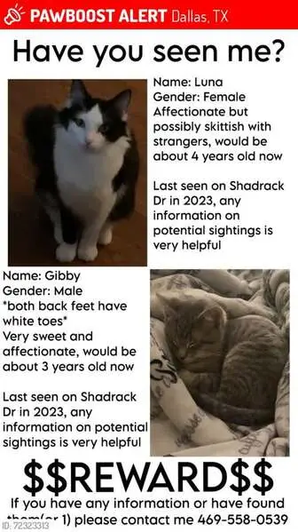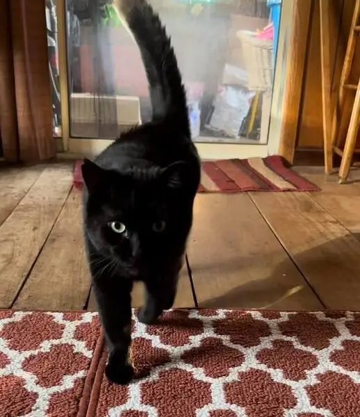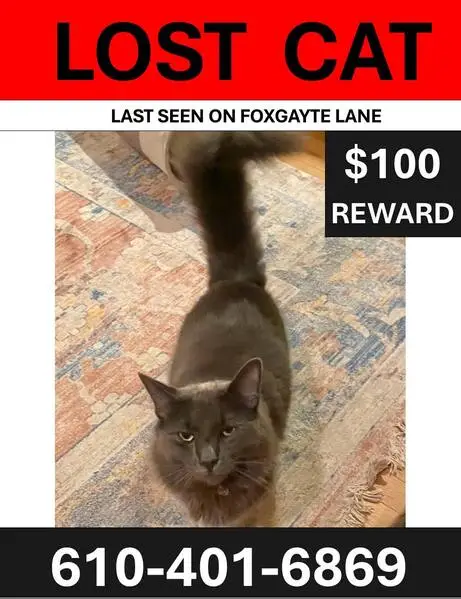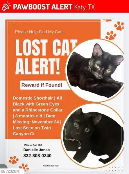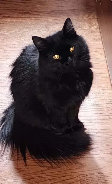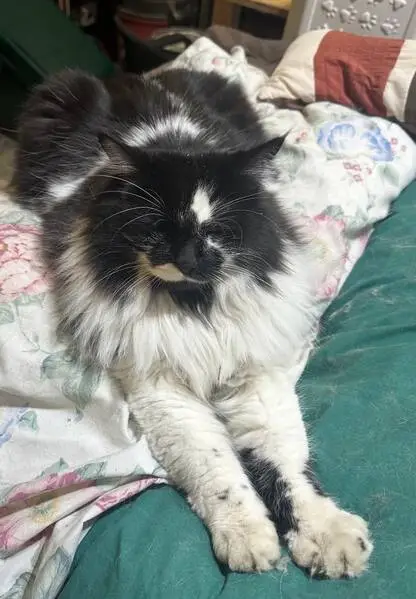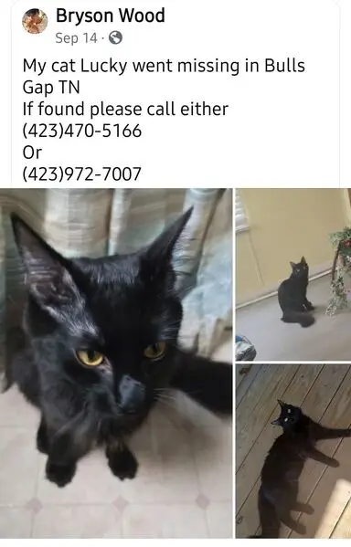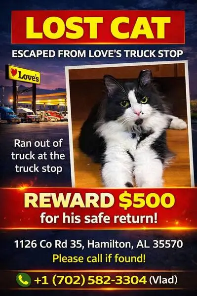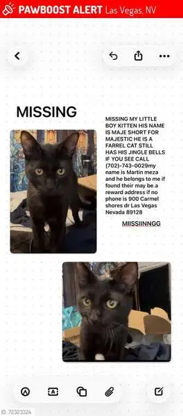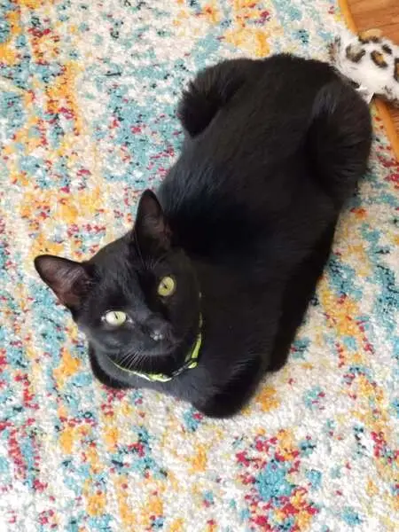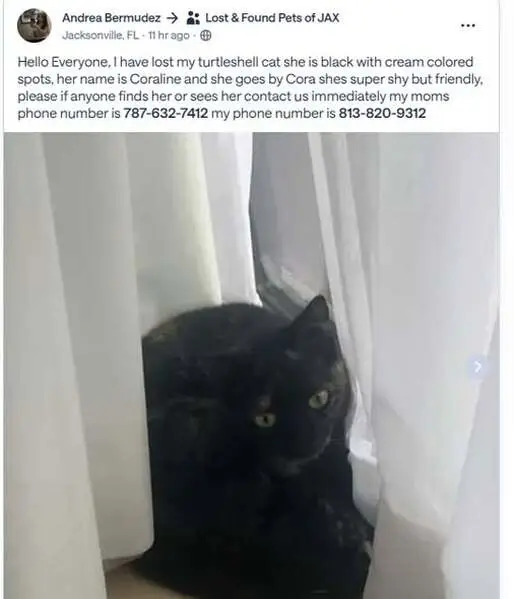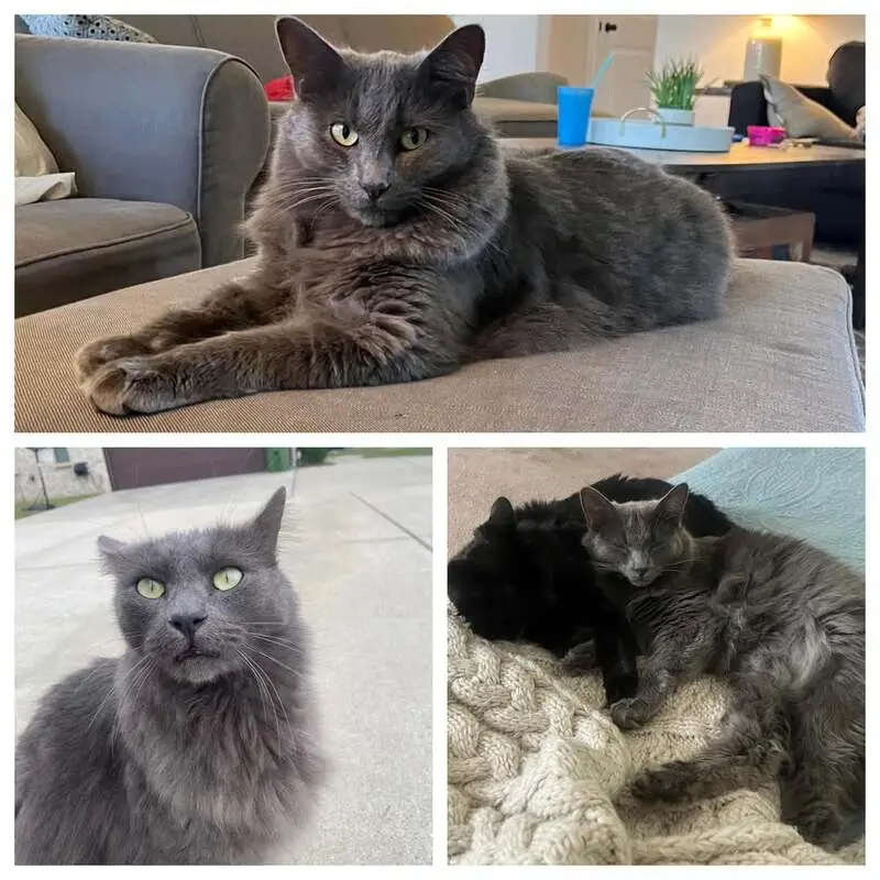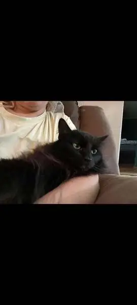 Wearing a harness, long haired pretty large (bigger than our full grown cat) calm but cautious. Was kind of skinny but I thinks it’s more an age thing because she seems older. Found at El Pollo loco where my son works. They had never seen her before,