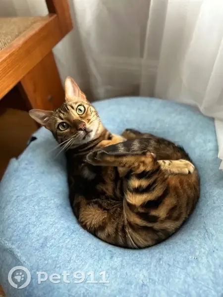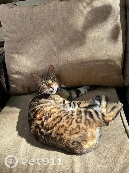 4 year old male bengal approximately 10lbs Brown rosettes on back, stripes on legs and spots on belly. Microchipped and neutered Very vocal, very friendly with people and dogs. Comfortable outside He had his belly shaved in August and it is shorter than the rest of his coat