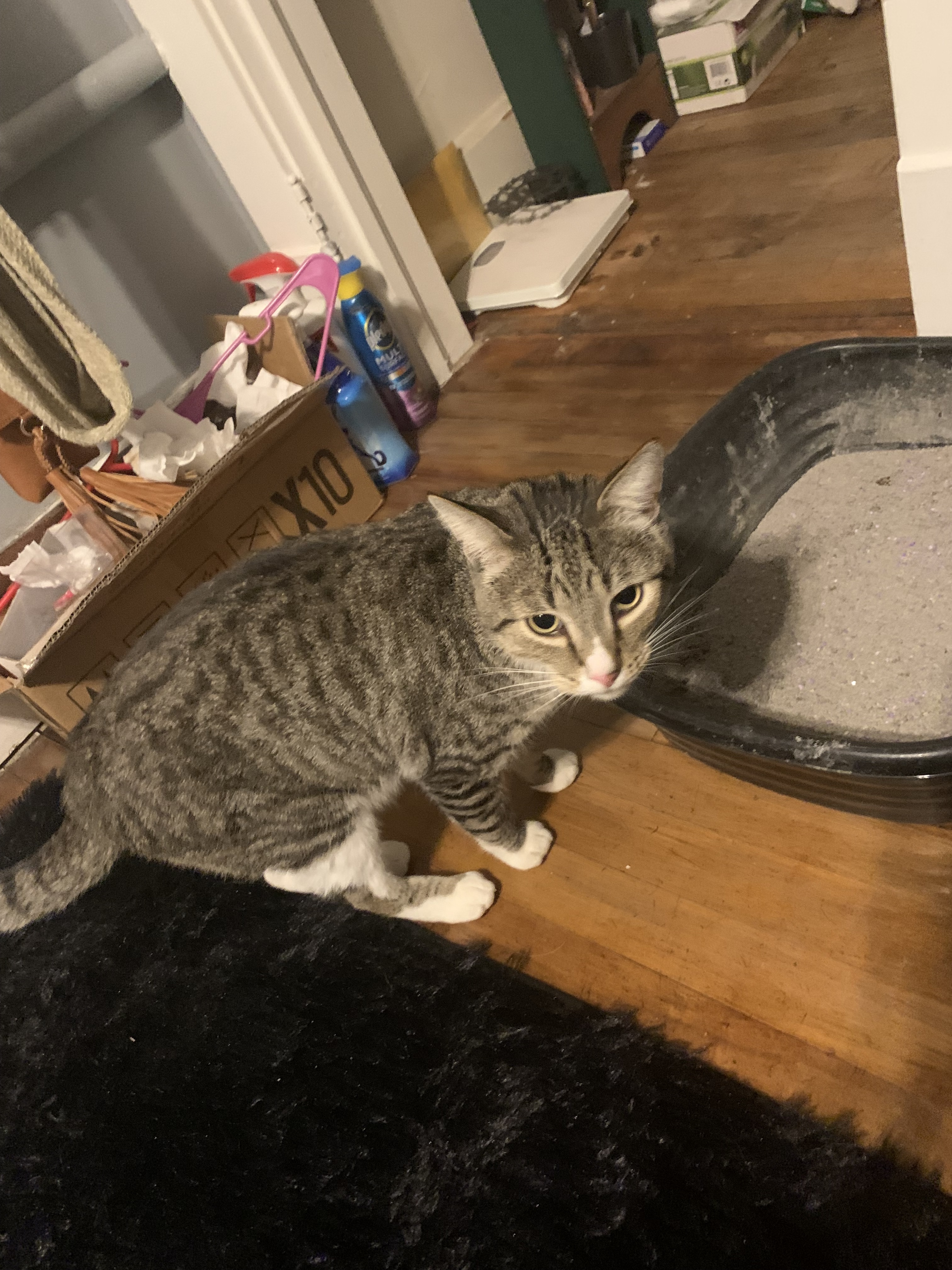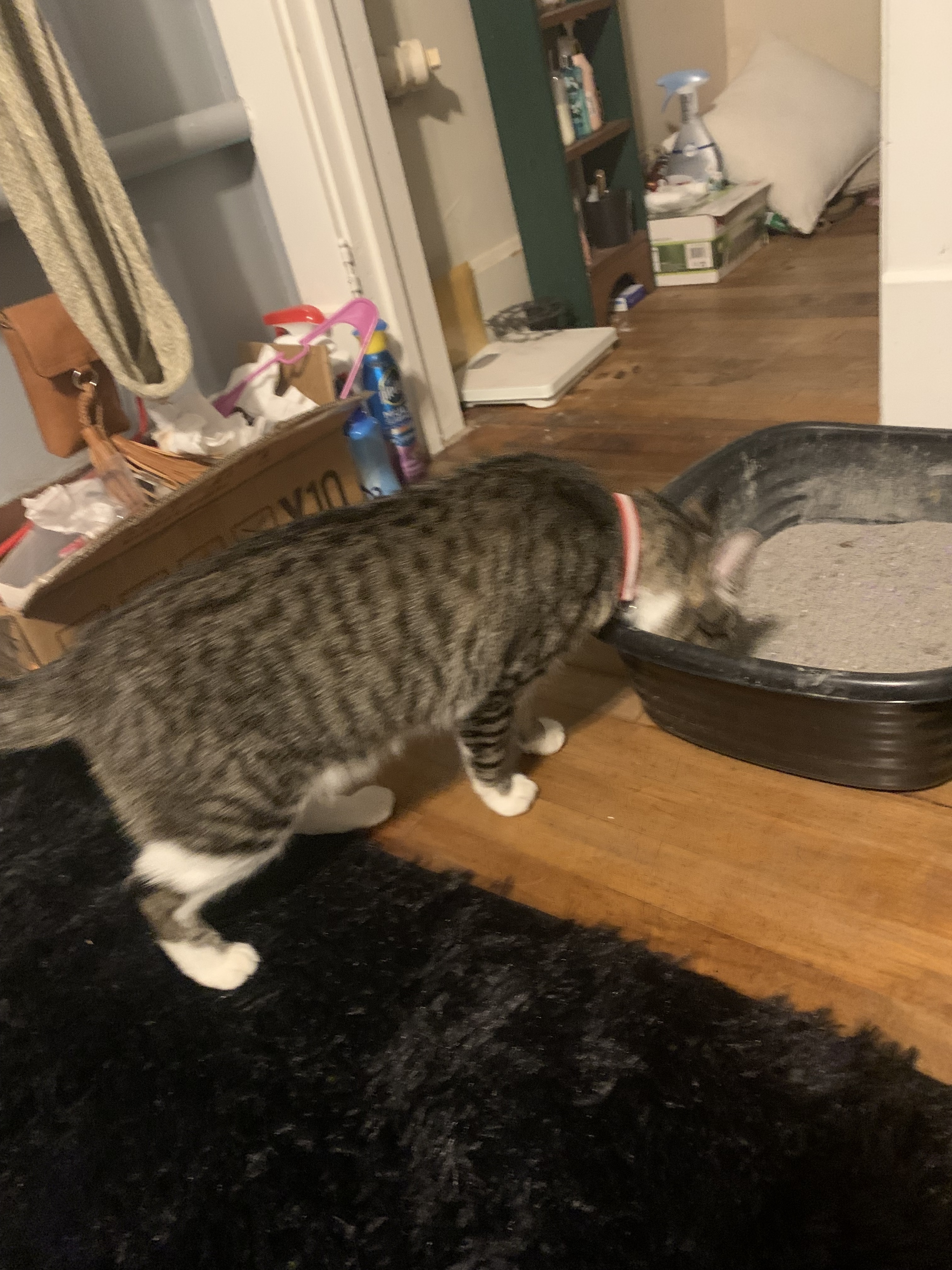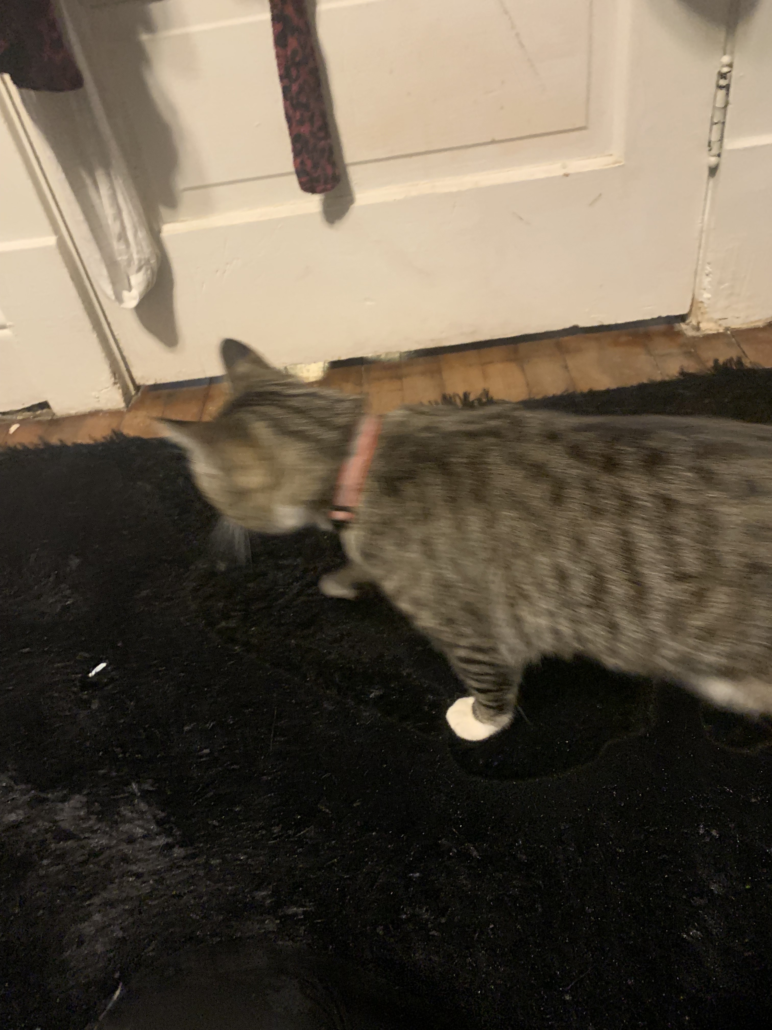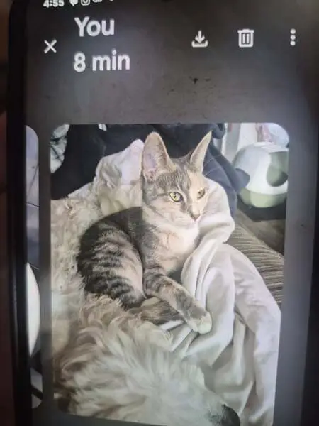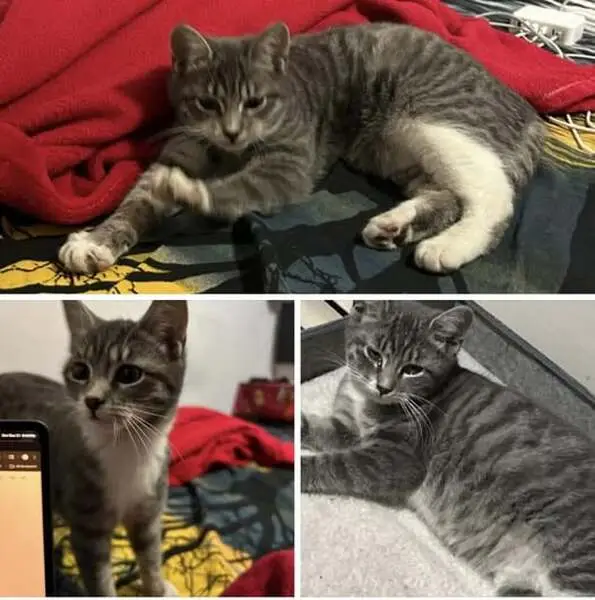 Black gray tabby has a red and silver gray collar very friendly was on my porch in wausau Wisconsin on fourth Street any information where he belongs to please let me know