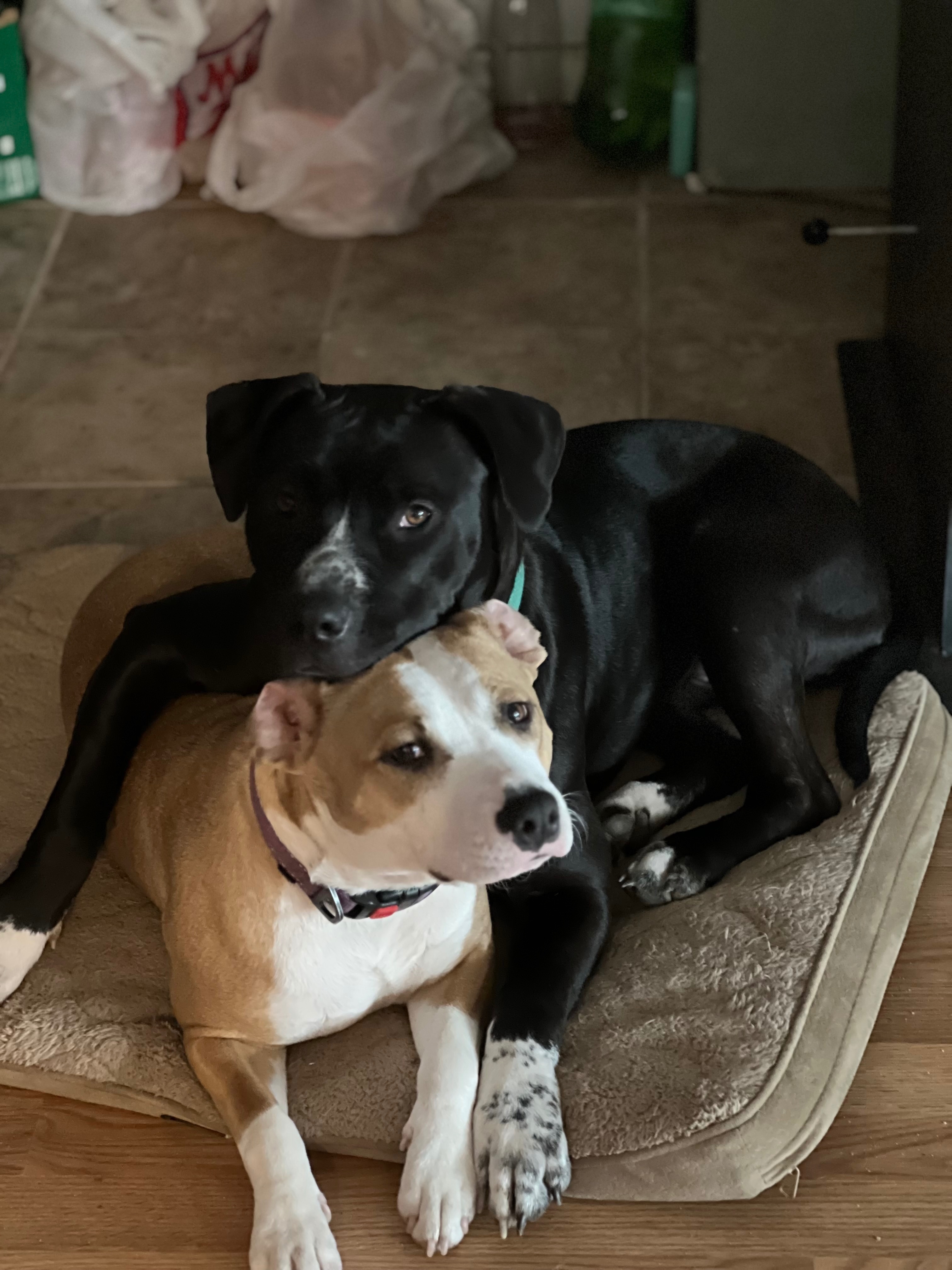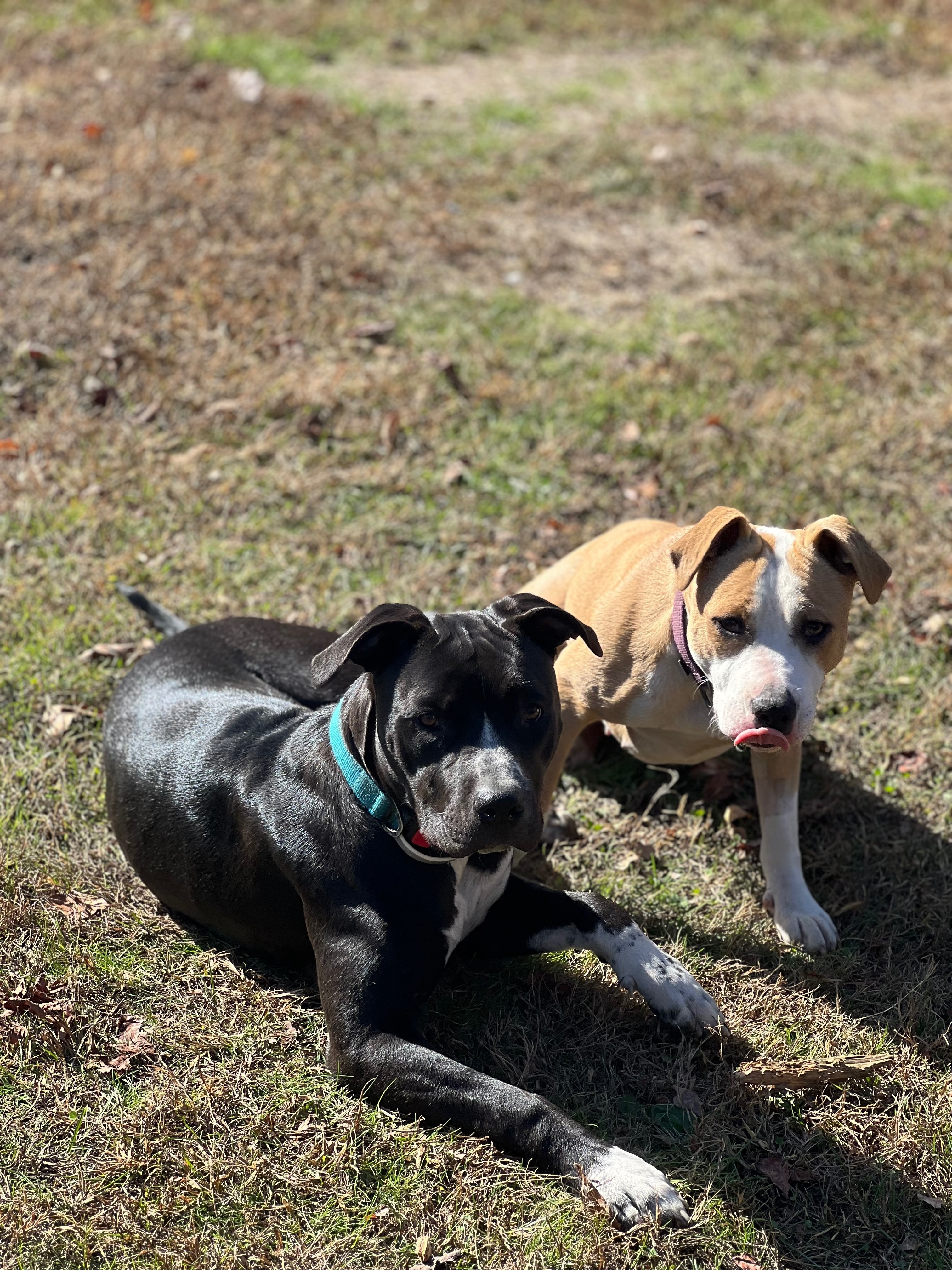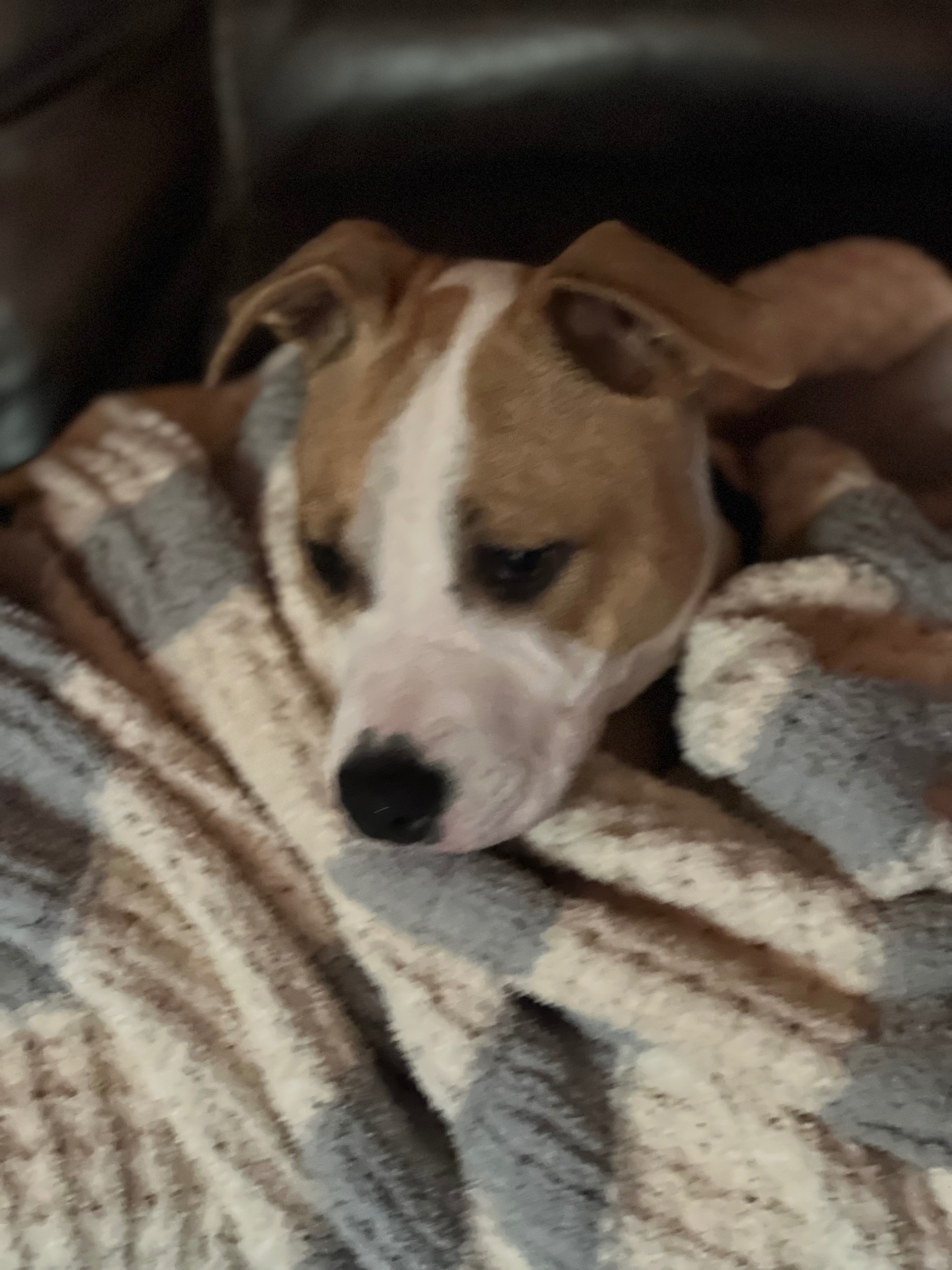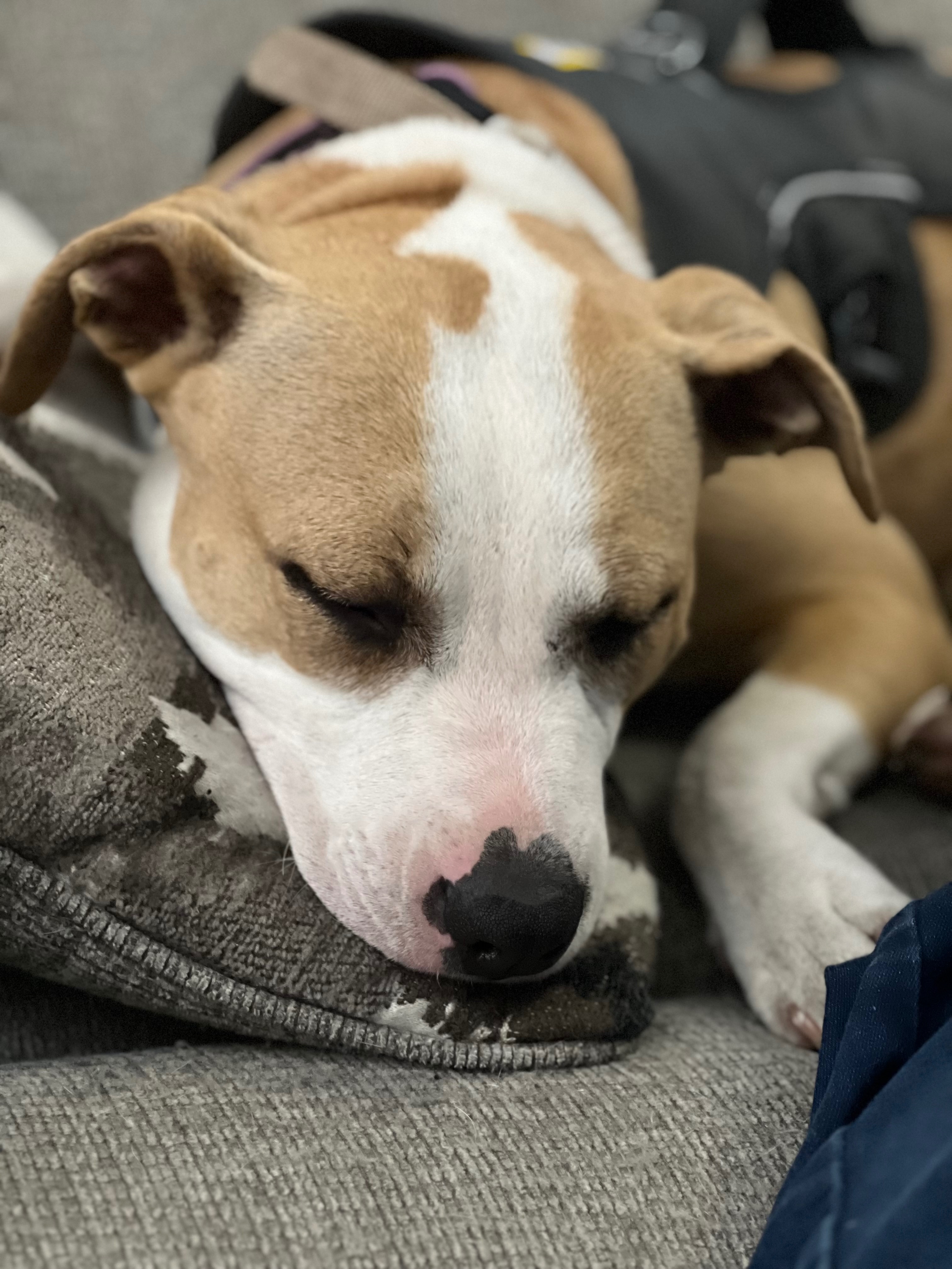 She s tan and white very friendly loves everyone she is wearing a purple collar she has a scar from playing with her sister above her right eye if she is looking at you she has some scars on her feet she has pink around her nose