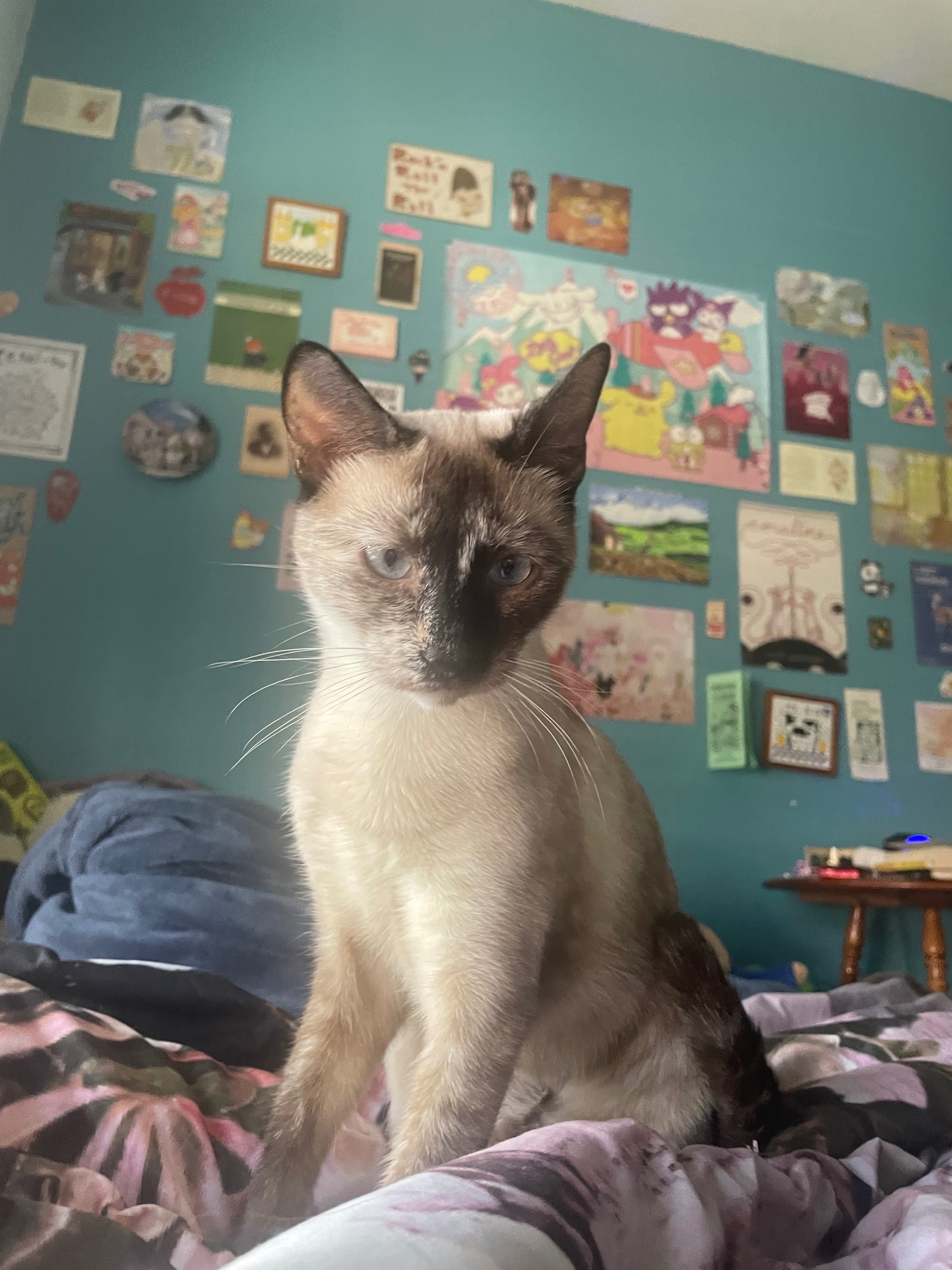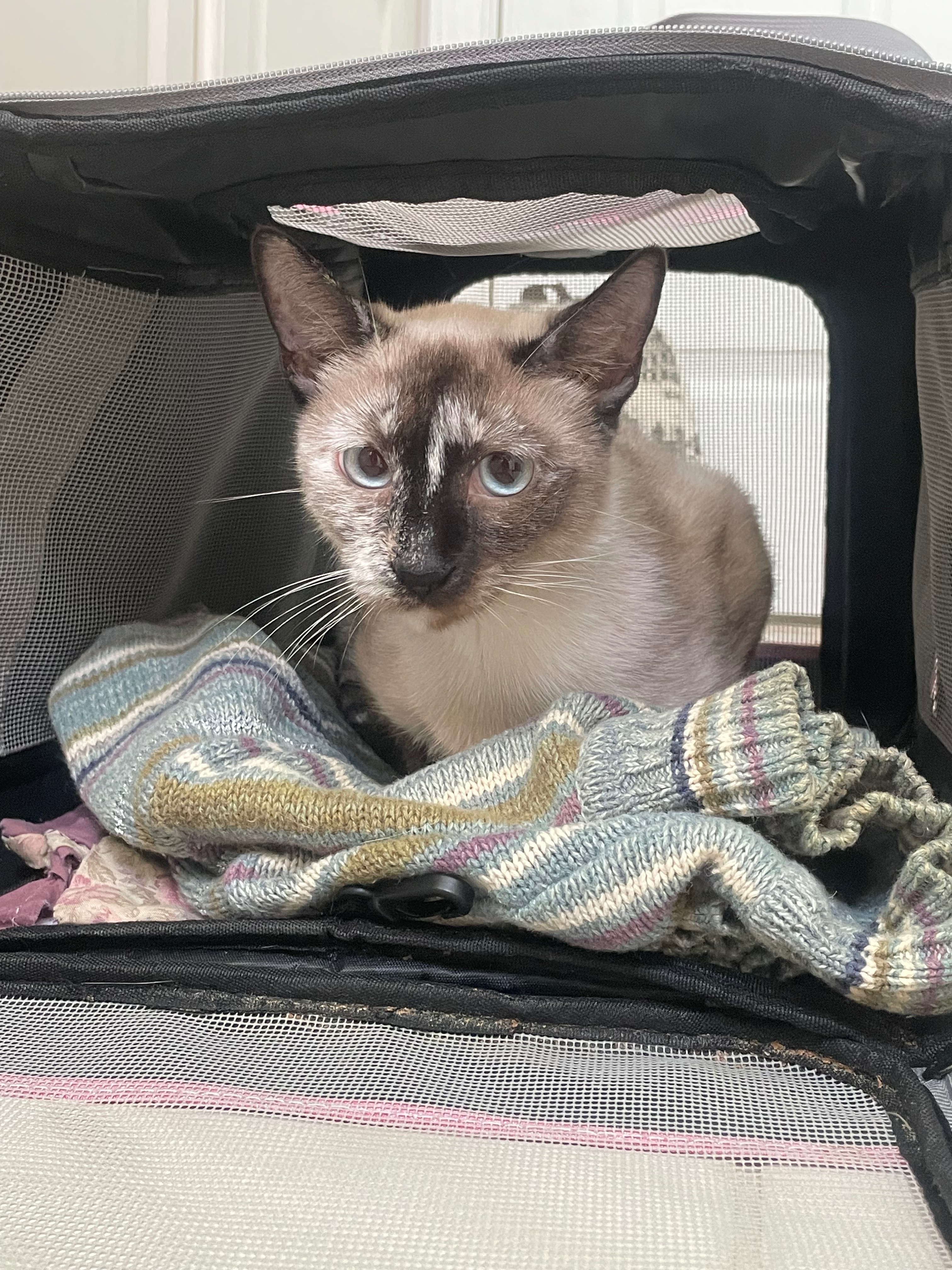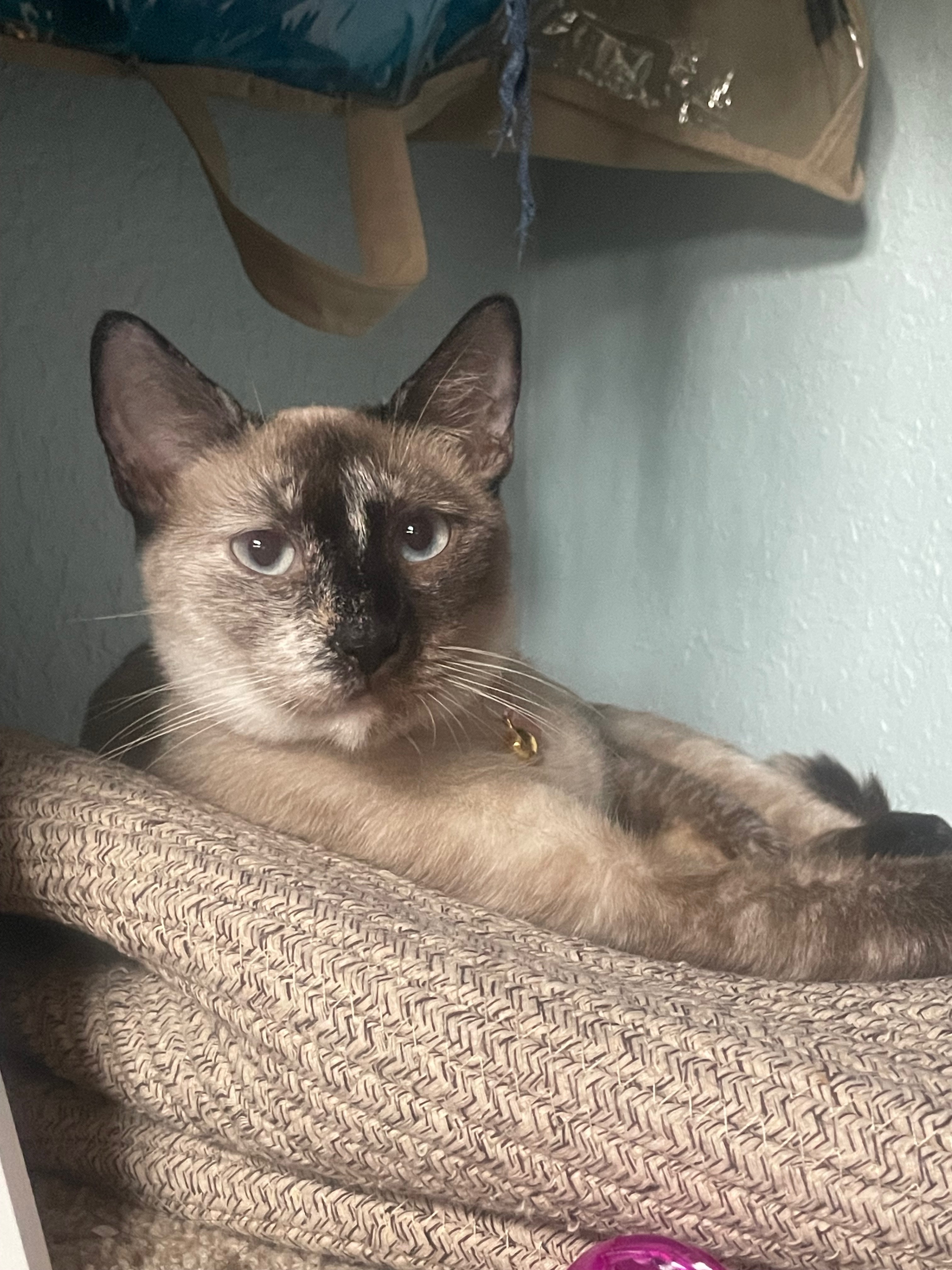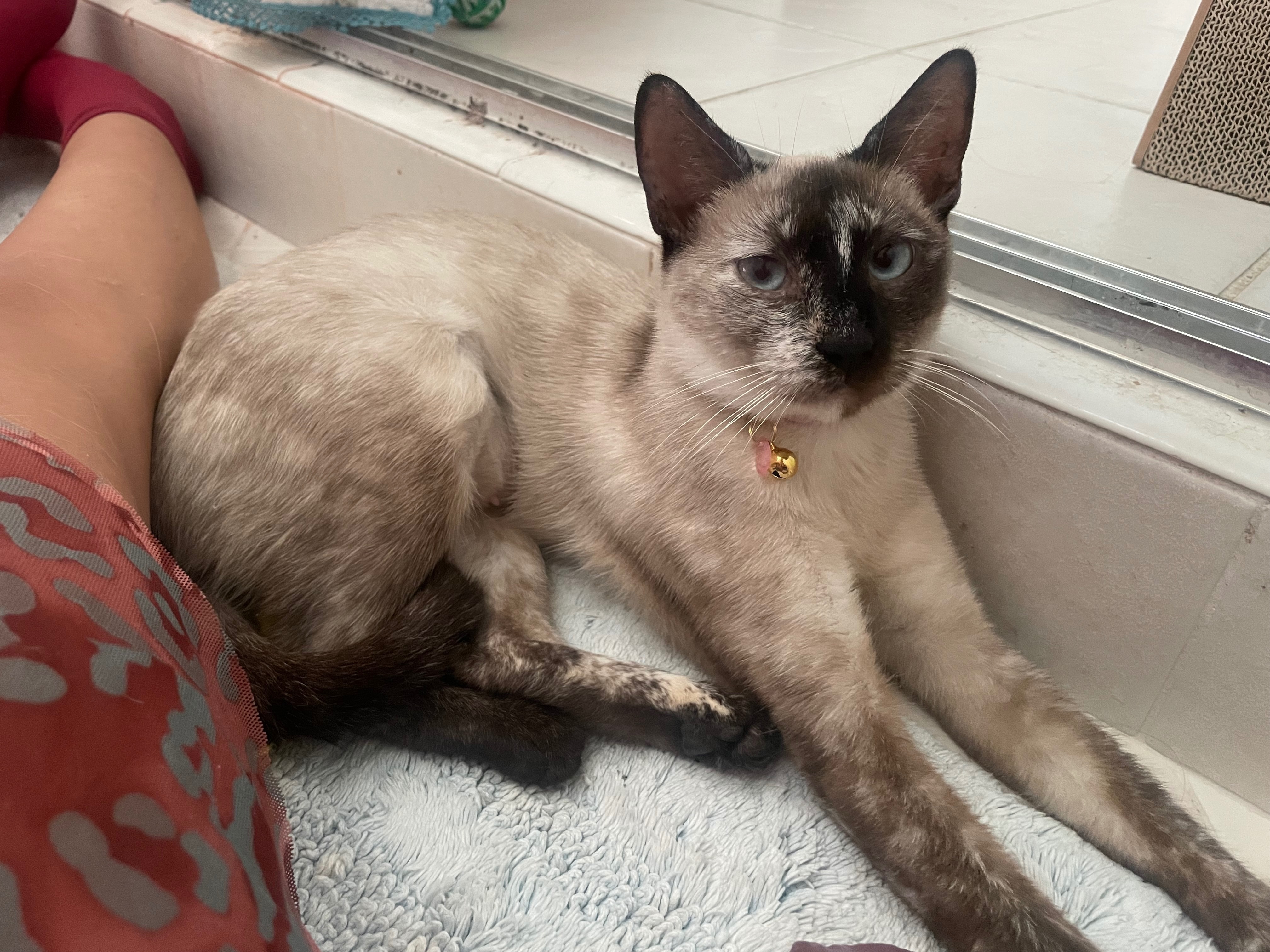 Fiona is a Siamese and Tortoiseshell mix so she has a unique spotted Siamese coat, mostly white with darker fur on her legs and half face with a bit of white at her ‘eyebrows’ and blue eyes. She ran out from our garage and has been missing since 5AM 12/17/2025. She is skittish and quiet but she is a sweetheart who likes pets so much she purrs at the touch. She likes playing with feather and bell stick toys and eats wet treats. I am desperate to find her