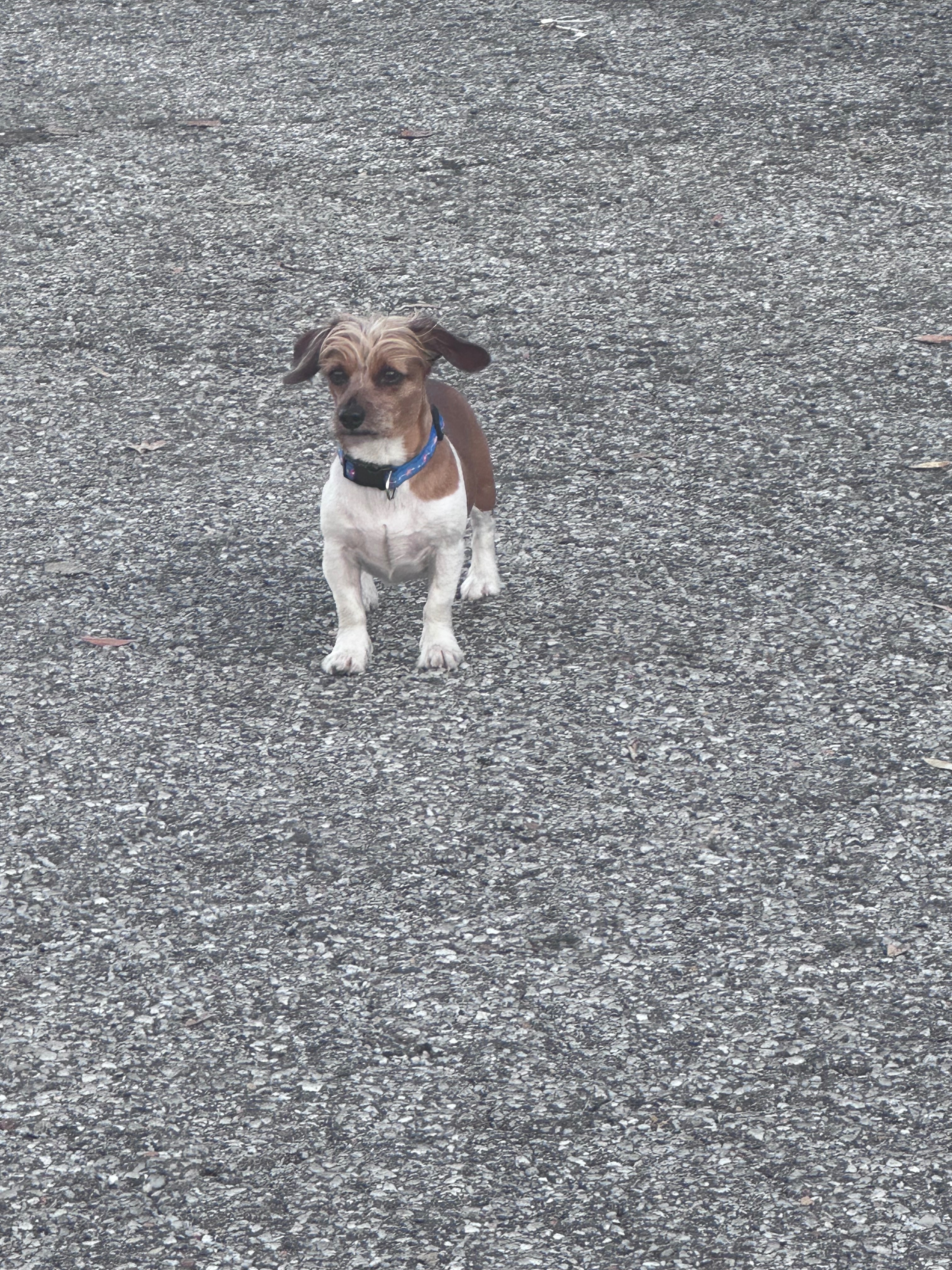 He is a dorky, white with brown. And has longer hair on his head. We were attacked by 2 pit bolls. And he ran away
