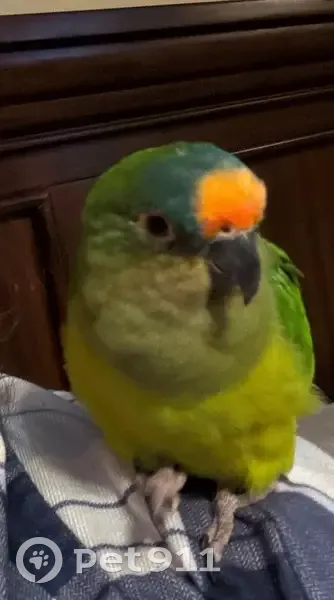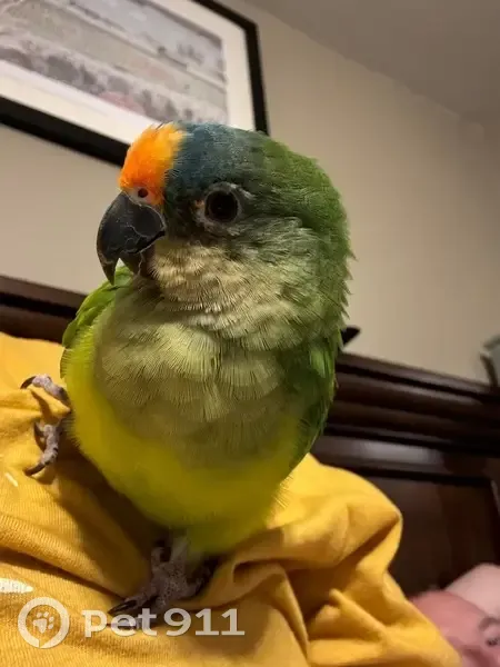 Was spotted in West Newton a few times- can talk. Will “step up” and ride on shoulders. Bright green body, darker blue/green head, blue/purple wings, orange spot on head. Black beak and nails.