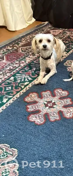 7lbs, white and tan markings, fluffy tail, friendly but a little skittish, she is a puppy mill rescue. Loves treats, black collar but no name tag, she is chipped. Seems to know her name. Loves to give puppy kisses.