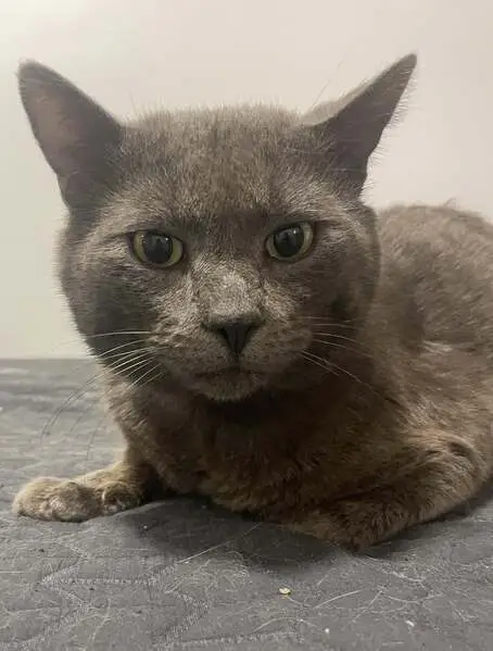 Cinder is a gray male cat around two years old he has super chubby cheeks and a purple collar with no tags he got out when the wind blew the door open