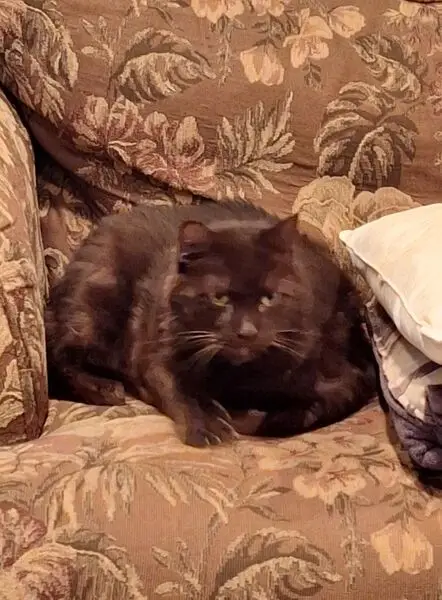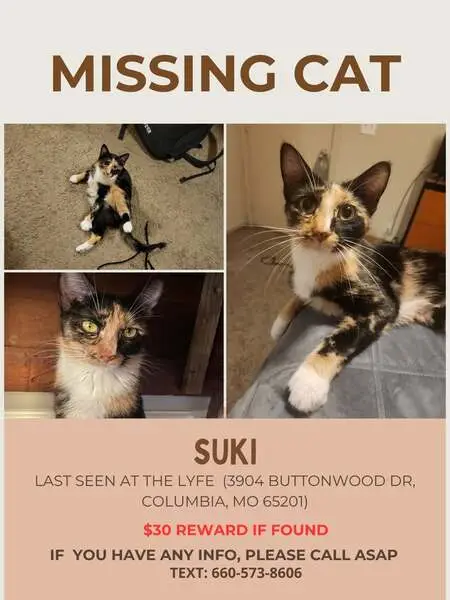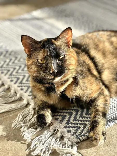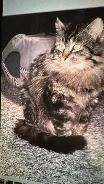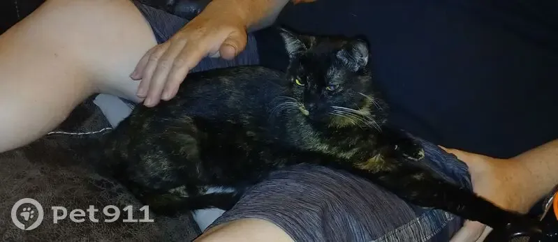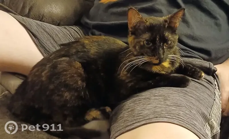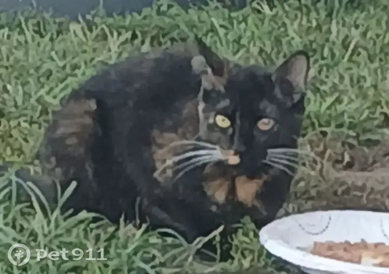 Female tortie cat with white whiskers. She's very sweet, she's obviously a house cat, she's very skinny and likes to eat, likes to get petted. Showed up in the Stonegate trailer court on East MacArthur a few days ago.