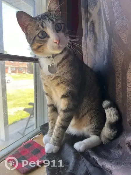 He is a brown-grey tabby with stripes he has a white face with a pink nose his paws are white. The day he went missing he was wearing his collar which is blue it has a tag with his name and are number.