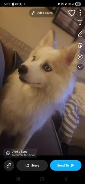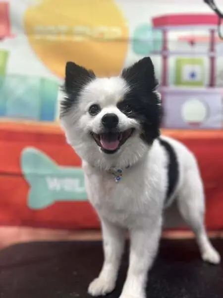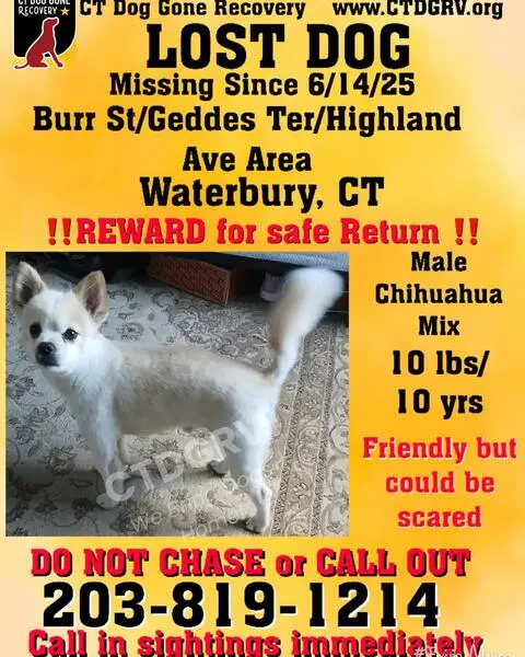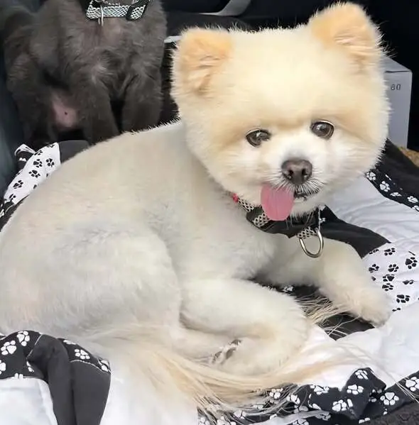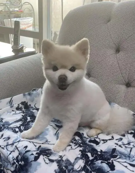 Off white tan coat, with light brown areas, very thick coat. Nails are long. Very friendly, well-behaved. Comes to both men and women.