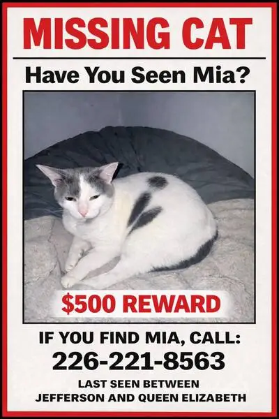 I found him out near McDonald's, in the cold and almost get hit by a few cars. He's fluffy and soft. He get brown gray black and white fur. Green or hazelnut color eyes. Big male cat. Has a blue collar with no ID tag. Isn't chipped.