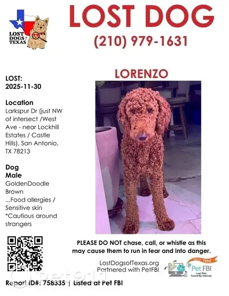 Missing dog San Antonio, photo: Help Find Lorenzo: Lost Goldendoodle!