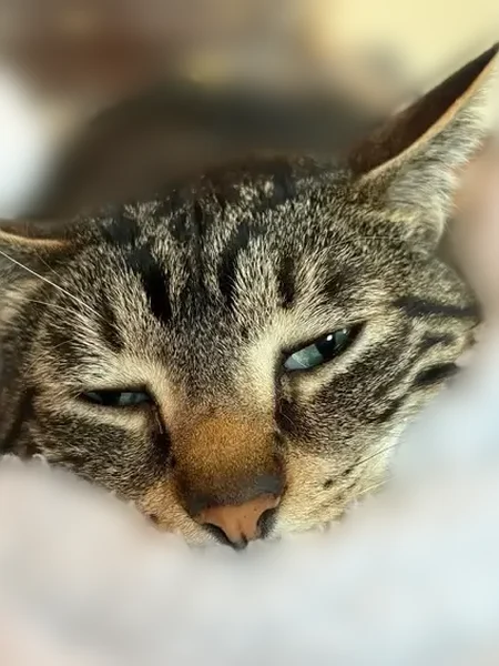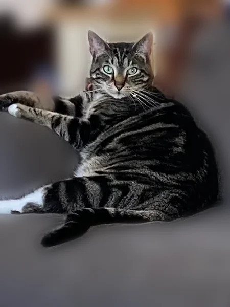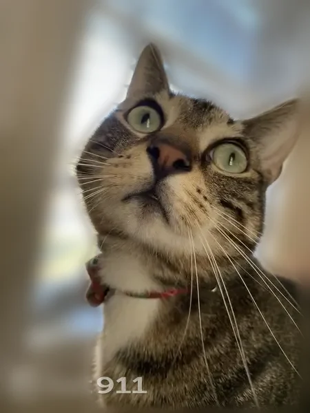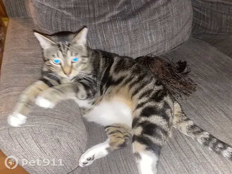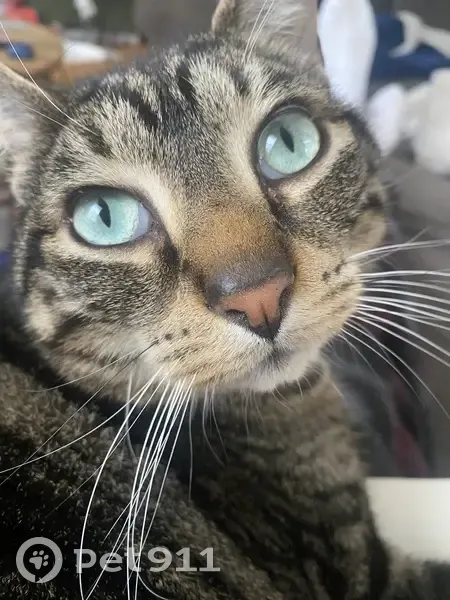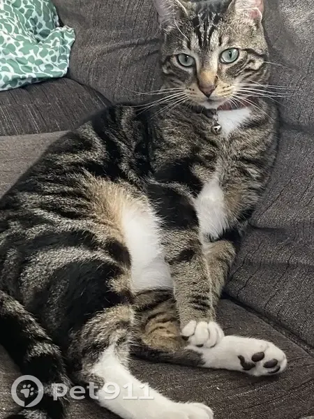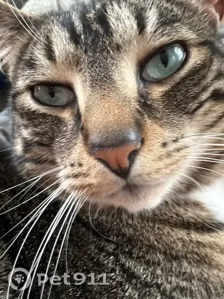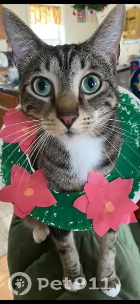 Ozzy is a tiger cat. He has a swirl pattern. His fur has darker patches. He has a black spot on right side of face, by his eye. His eye color is a blue green. He has a white belly, and legs. He is wearing a Christmas collar. He has one black whisker. He is an indoor cat. He is microchipped.