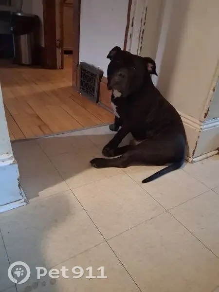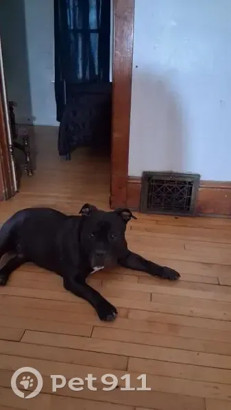 Black with white chest, medium dog with stocky build, the backdoor did not get properly patched and he pushed his way out. Happened this morning around 11am