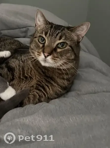 Brown with black stripes. Green eyes. A little white close to his mouth. No front claws. No collar. Neutered. Very friendly! We believe he snuck out when we were letting our dogs outside and we haven’t seen him since.