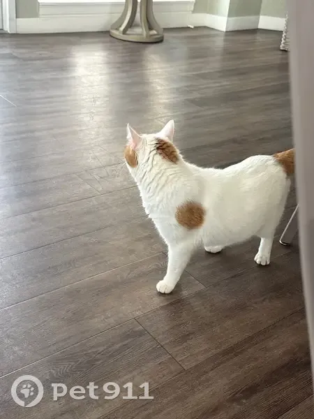 He was accidentally let outside at 1:00am. He is white with orange ears and tail and orange markings on his back. He responds to his name and loud clapping