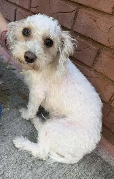 White curly hair, no collar, mostly scared of new people, went missing because he started roaming around. Then a white truck pulled up, not sure if they took him because the bushes cover the camera view but it looks like they did because my dog never came came from that place.