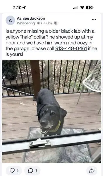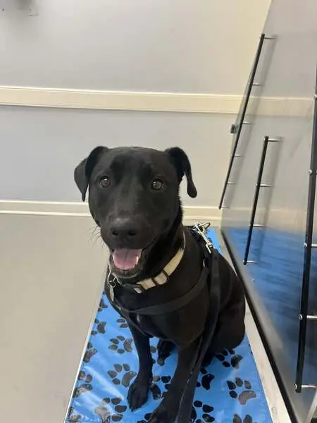 Black lab/pointer mix with white stripe down his chest with black spots. He got out of our gate first thing in the morning. No collar but is chipped. Very sweet boy.